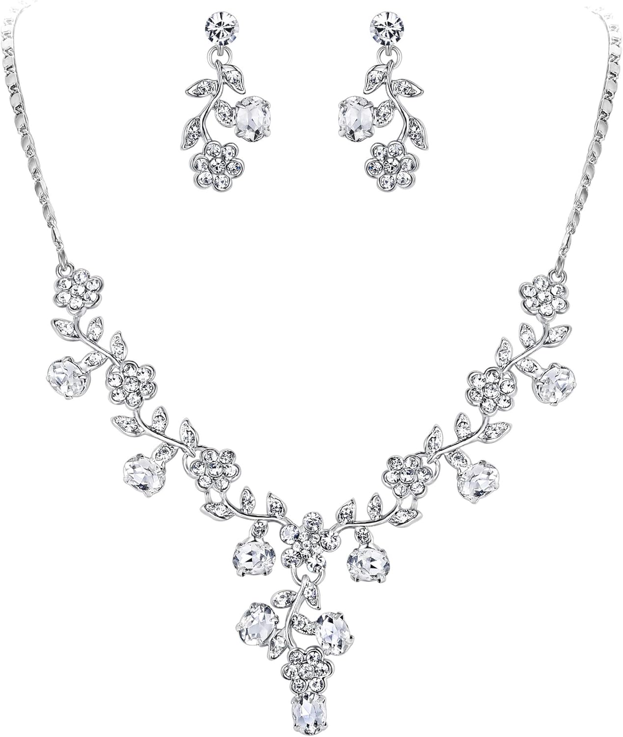EVER FAITH Bridal Jewelry Sets for Wedding Rhinestone Crystal Flower Leaf Costume Pendant Necklace Earrings Set for Women