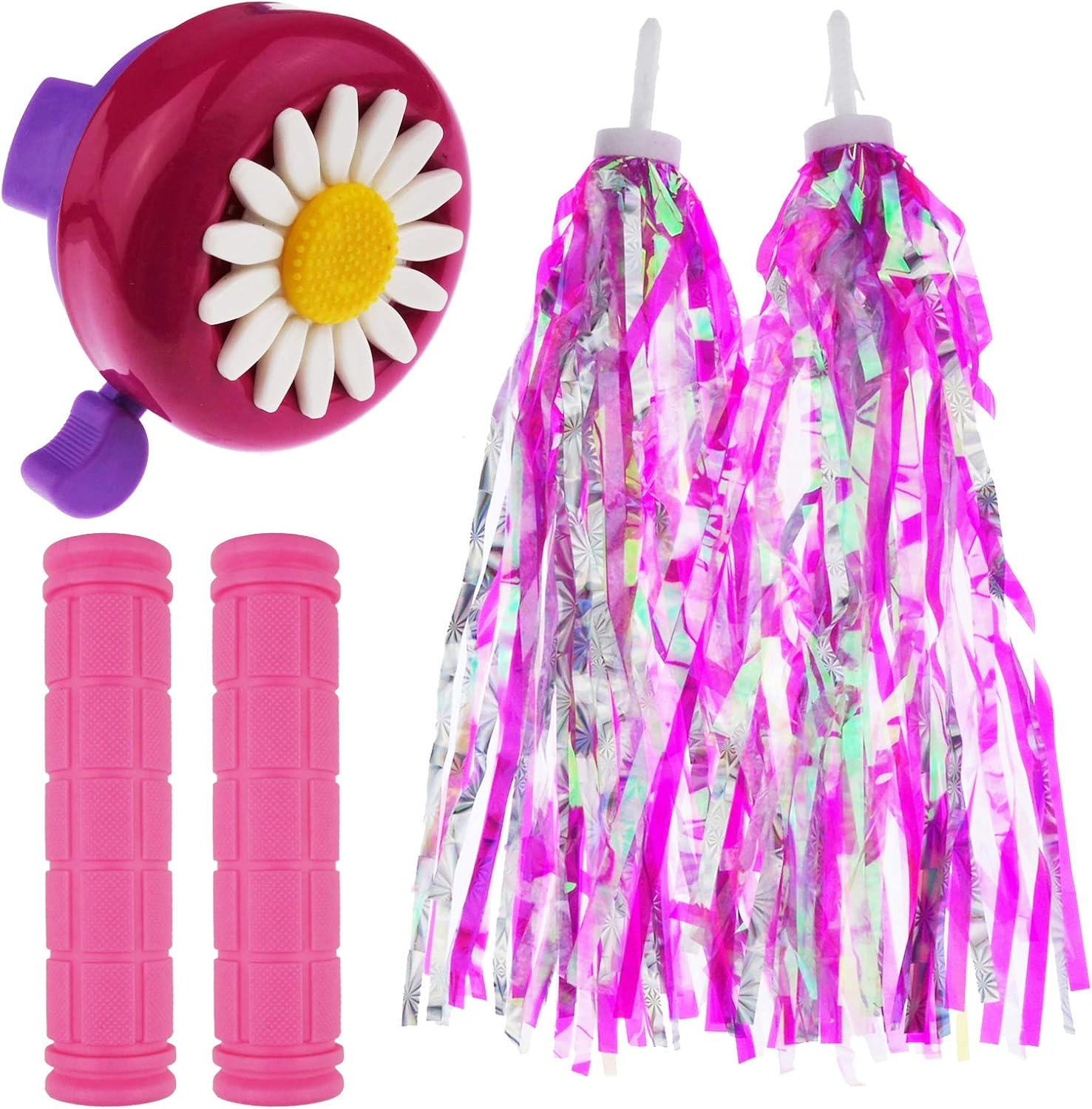 Package included: 1 Pairs bike streamers 1 pack bike bell and 1 Pairs Bicycle Handle Bar Grips