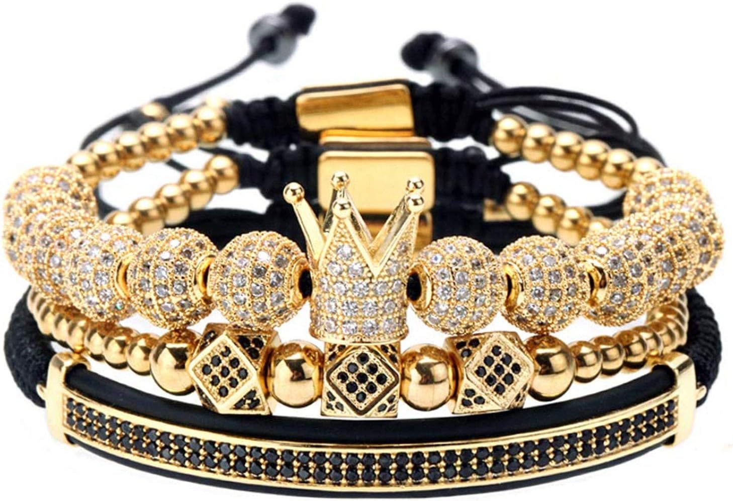 GVUSMIL Luxury CZ Imperial Gold Crown Bracelets Set King Royal Style with 8mm Zirconia Beads Braided Pulseira Bangle Charm Jewelry for Men
