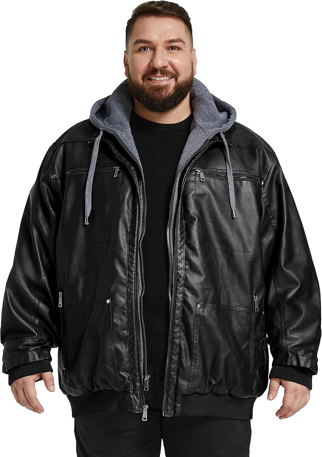 wantdo Men's Big and Tall PU Faux Leather Jacket Zip-Up Motorcycle Bomer Jacket Casual Winter Coat with Removable Hood