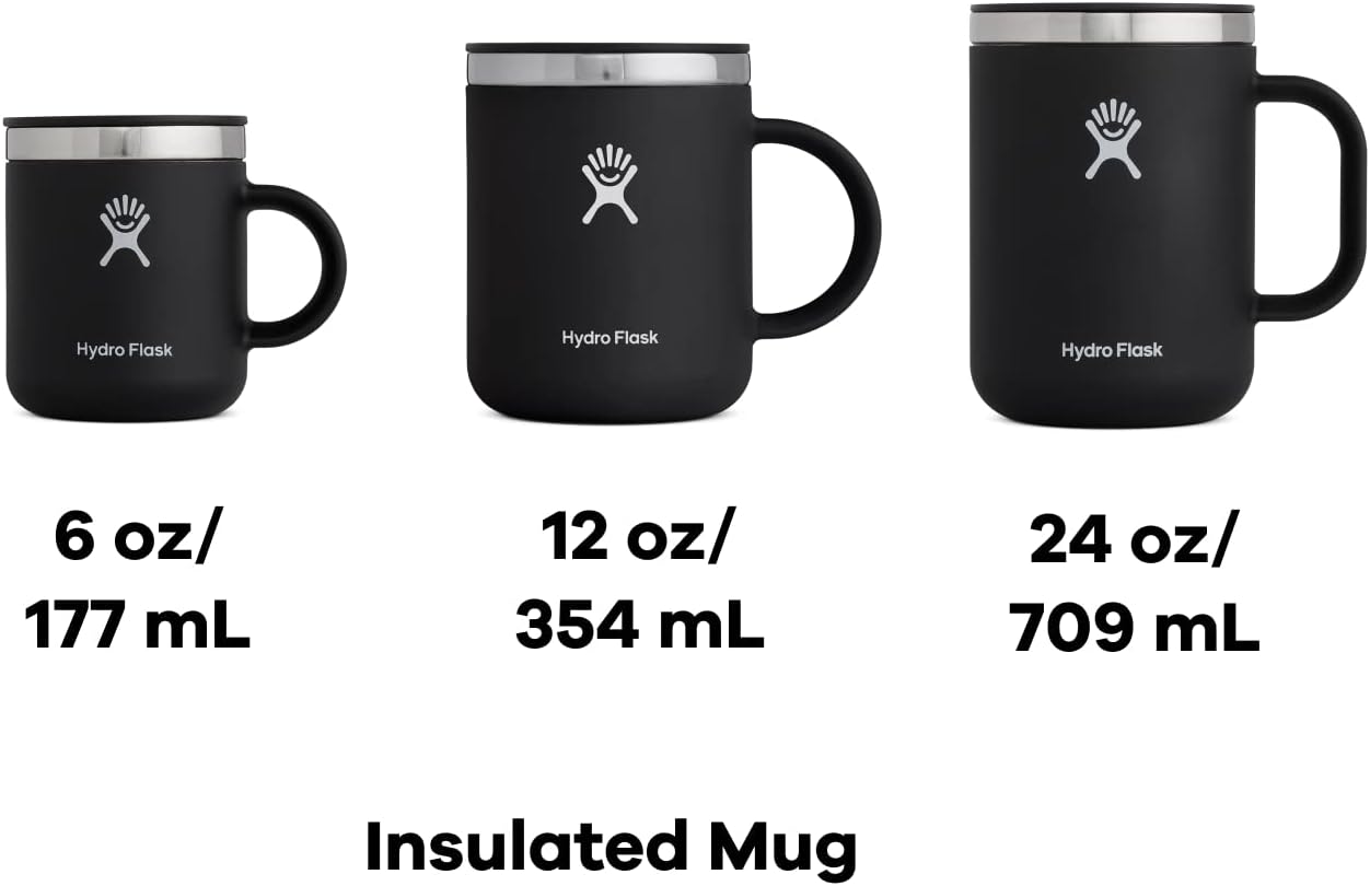 12 OZ INDIGO BLUE INSULATED MUG: The Hydro Flask stainless steel insulated mug keeps drinks hot for hours. Sized for the perfect cup with a closeable, leak-resistant and splash-resistant lid.