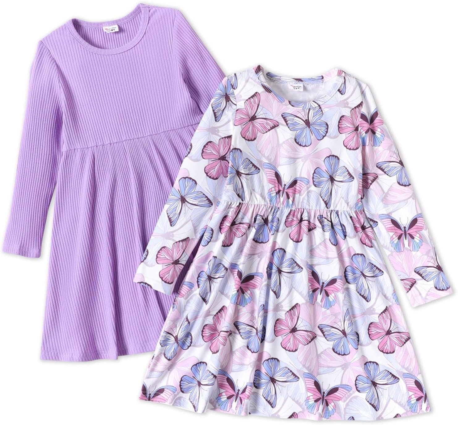 PATPAT Toddler Girl Long Sleeve Dresses 2-Pack – Ribbed Cotton & Woven A-Line, Soft Fall Outfits for Girls, Sizes 18M–10Y