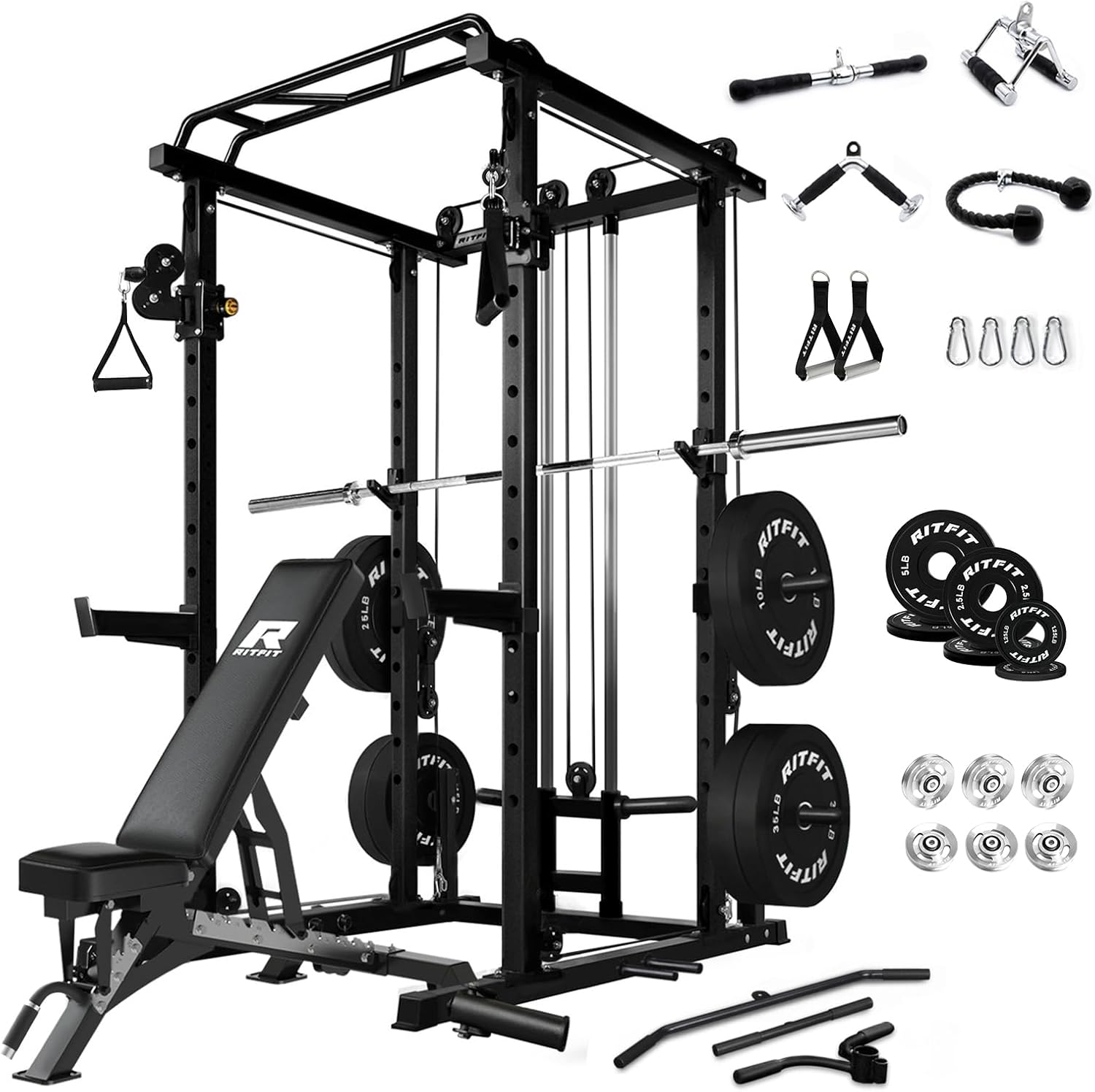 RitFit Multi-Function Squat Rack Power Cage PPC03 with Cable Crossover System, 1000LBS Capacity Power Rack and Packages with Optional Weight Bench, Barbell Weight Set, for Garage Workout & Home Gym