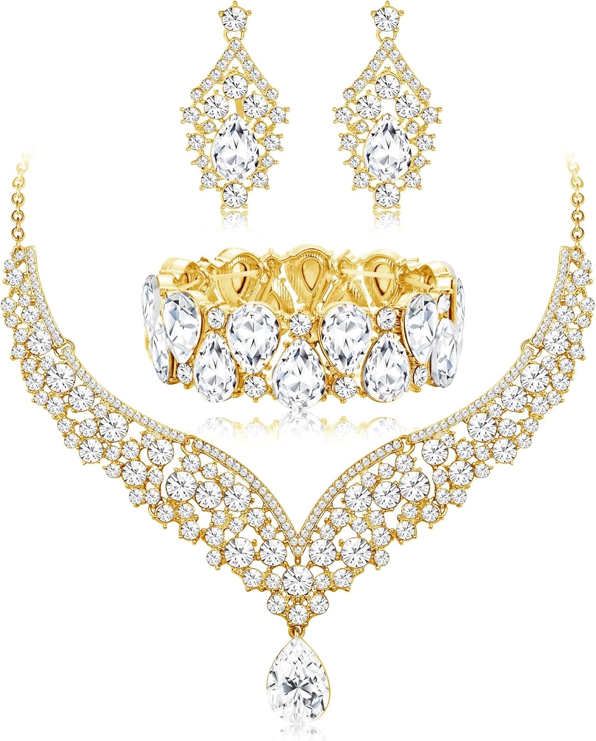 IRONBOX Crystal Wedding Bridal Jewelry Set for Women Prom Sliver Rhinestone Teardrop Necklace Earrings Bracelet Wedding Bridesmaid Gifts Fit with Wedding Dress