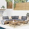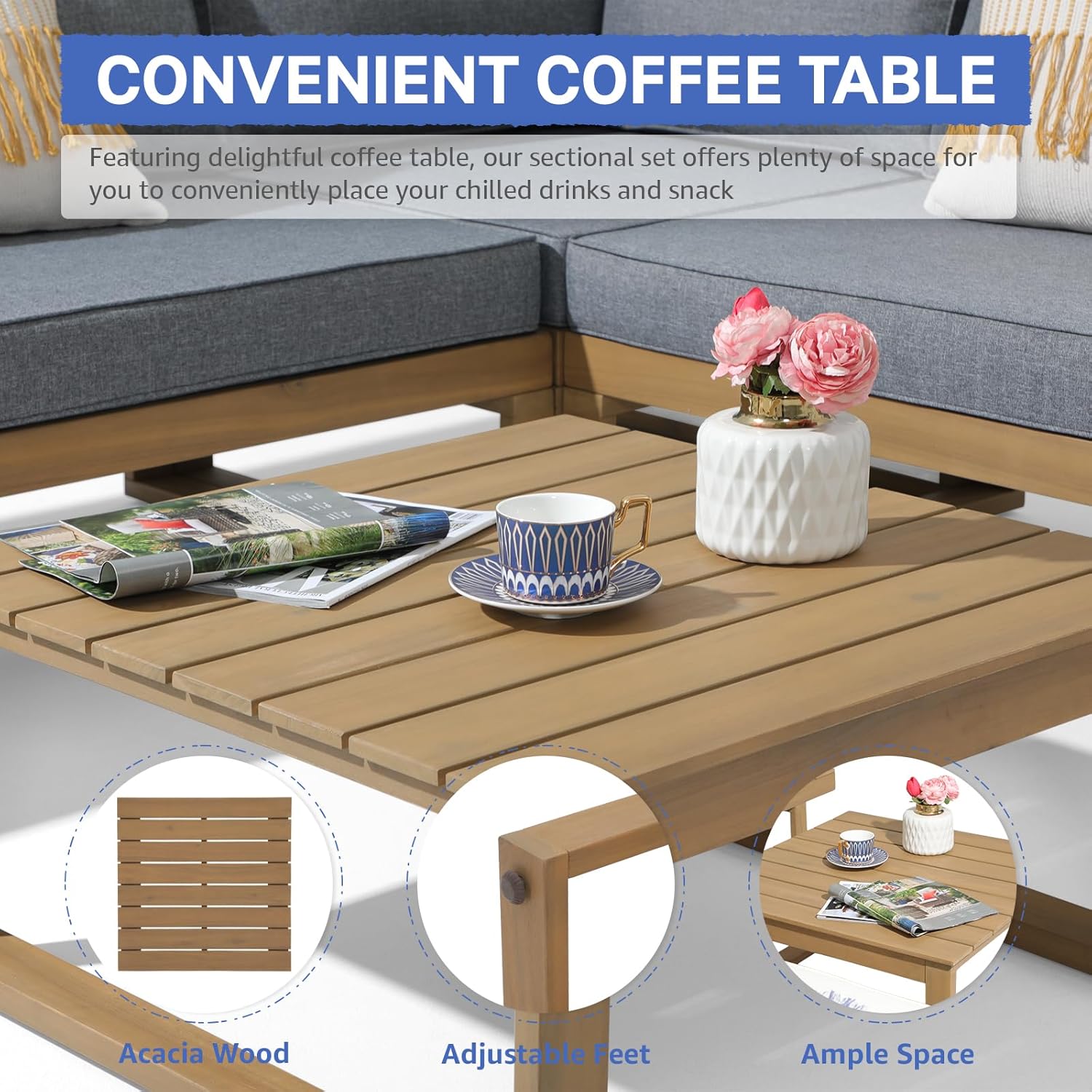 Soleil Jardin 4 Piece Acacia Wood Patio Furniture L-Shaped Outdoor Sectional Sofa Set with Coffee Table, FSC Certified Conversation Set with Built-in Side Table and Grey Cushions for Garden