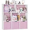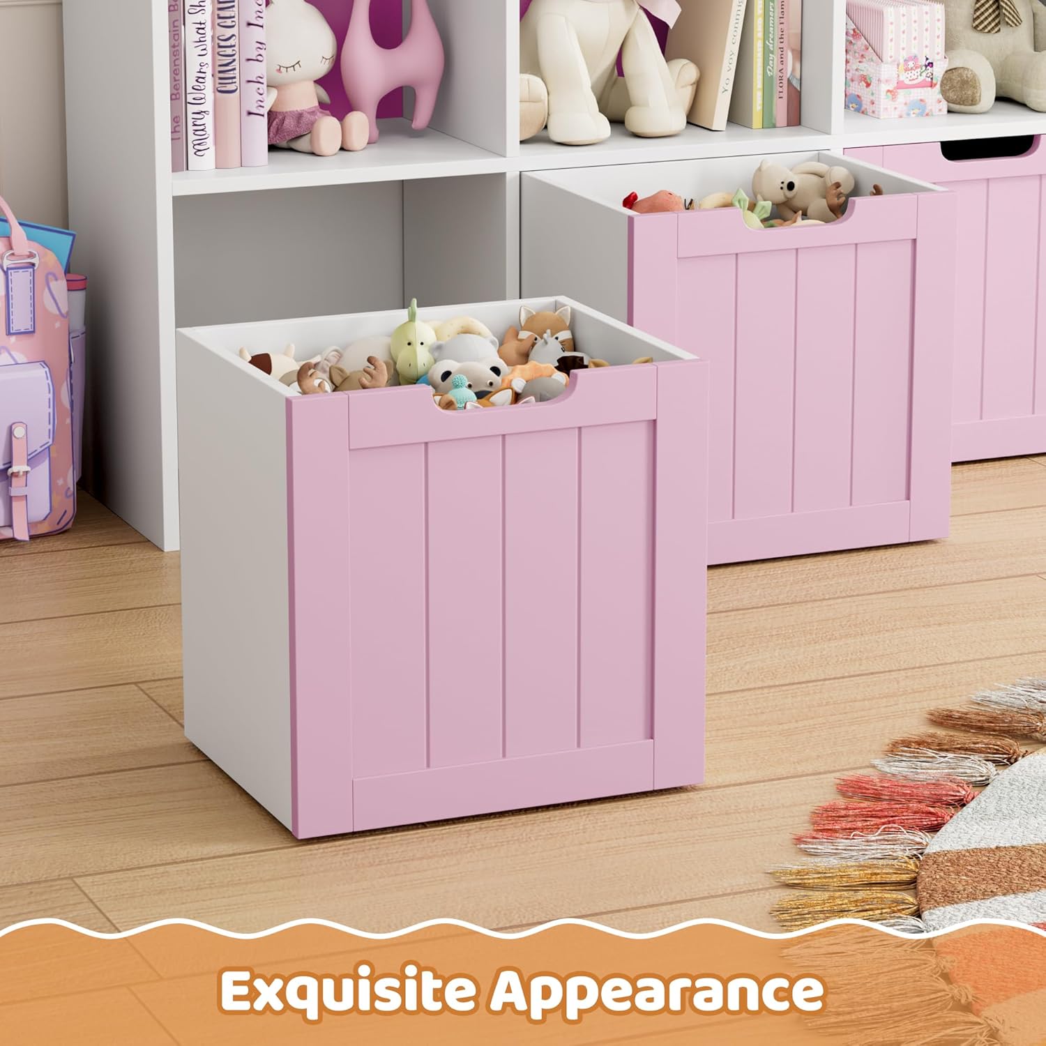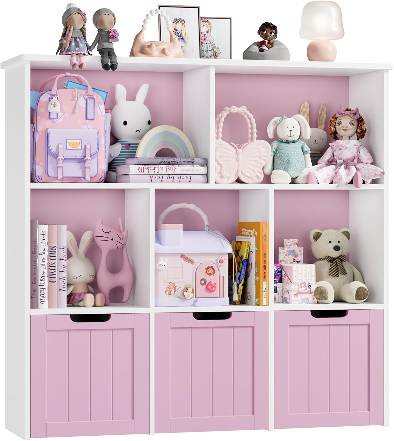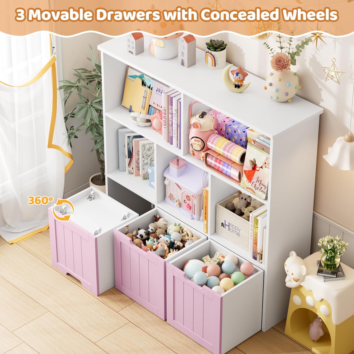 FOTOSOK Toy Storage Organizer with 3 Movable Drawers, Floor Storage Cabinet Toy Chest with Hidden Wheels and 5 Storage Cubbies, Multifunctional Storage Chest for Living Room, Home Office, Pink