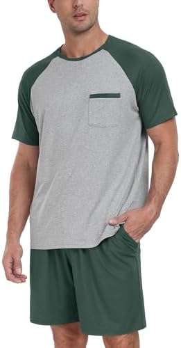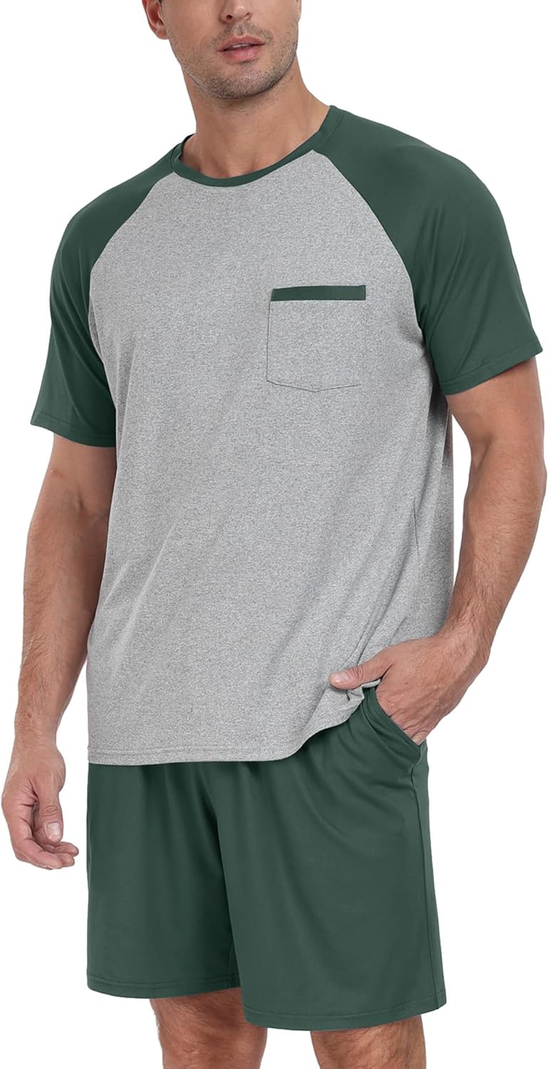 PrinStory Mens Pajama Set Summer Pjs Sleepwear Nightwear Lightweight Quick Dry Soft Short Sleeve Sleep Set With Pocket S-4XL