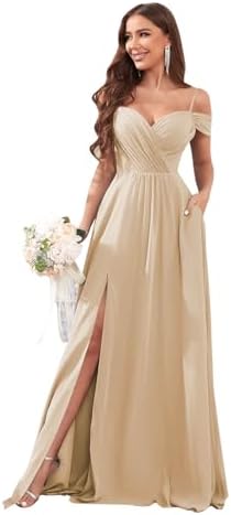 Sukleet Women's Off Shoulder Bridesmaid Dresses Long Slit Chiffon Ruched Evening Formal Dress with Pockets