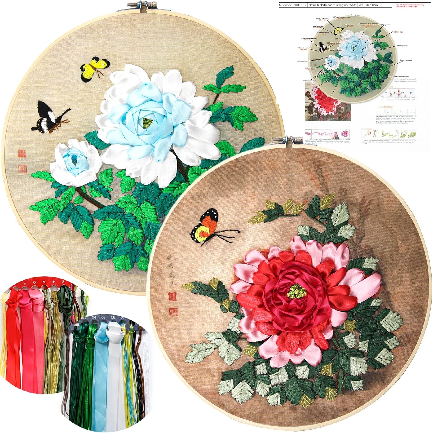 【Contains】Each kit contains silk ribbons, 6-strand carded floss, needles, 2 pre-marked canvas fabrics, a 12'' hoop and instructions.