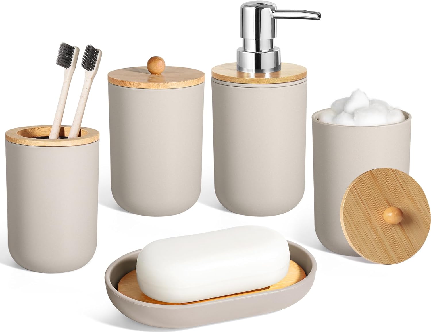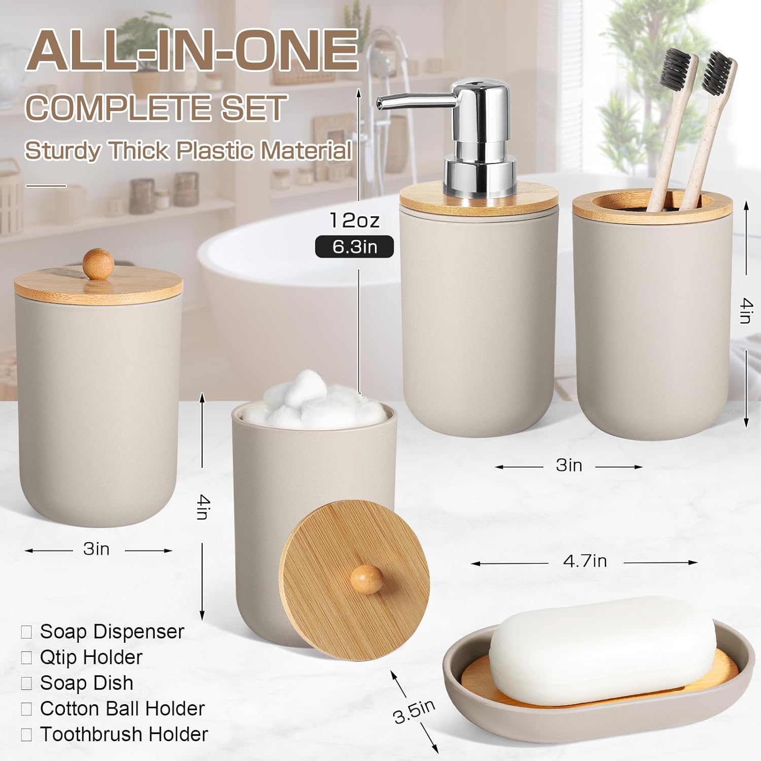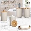 Bathroom Accessories Set 5 Pcs, Plastic Beige Bathroom Decor, Soap Dispenser and Toothbrush Holder Set, Soap Dish, Cotton Swab Jar, Bathroom Set, Boho Bathroom Organizer Accessory