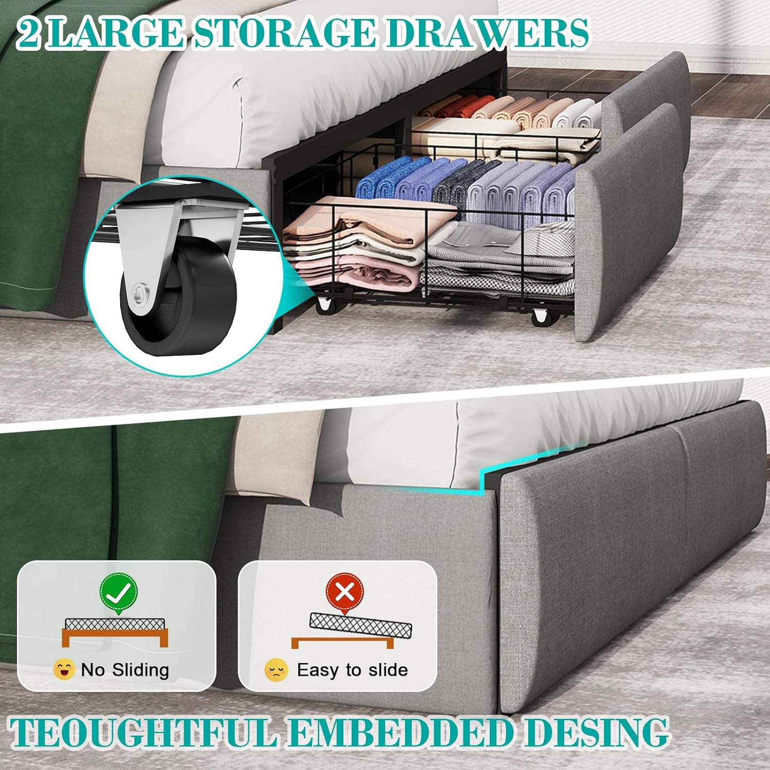 Multi-Function Storage Space: The headboard features 2 tiers of storage shelves to keep items such as cell phones, headphones and books within easy reach. 2 large-capacity sliding drawers can easily store seasonal bedding, spare pillows, and other sundries, greatly increasing bedroom storage space and making the room clean and tidy