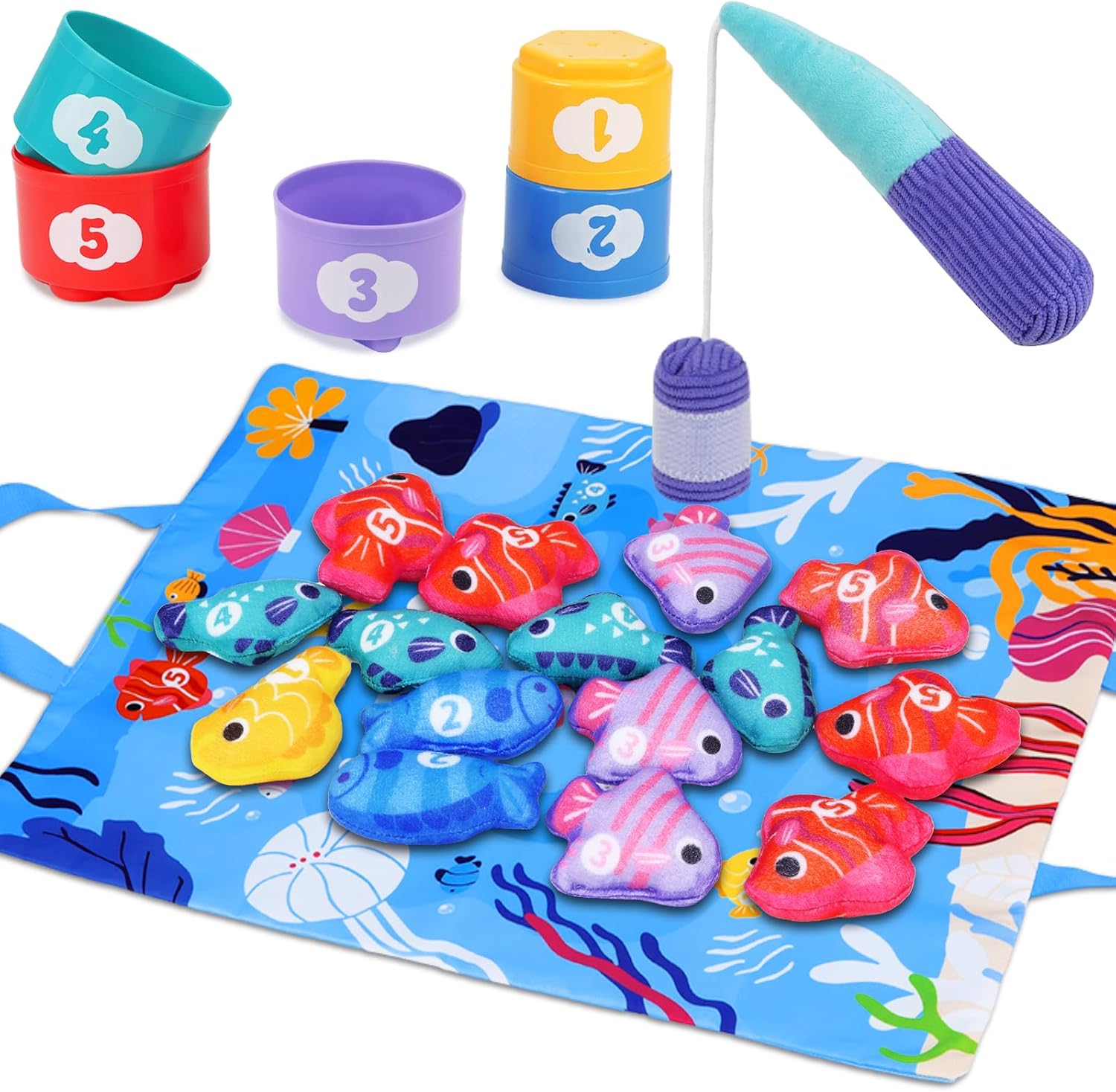 Montessori Fishing Toy Set: You will receive a fishing pole, 15 pcs cloth fish, 5 pcs stackable fish buckets, and a play mat that doubles as a storage bag. As a baby toys 12-18 months to explore and try, it awakens the curiosity of the children, helps them explore, experiment and discover. Ideal toddler toys for 1 2 3 year old boys and girls