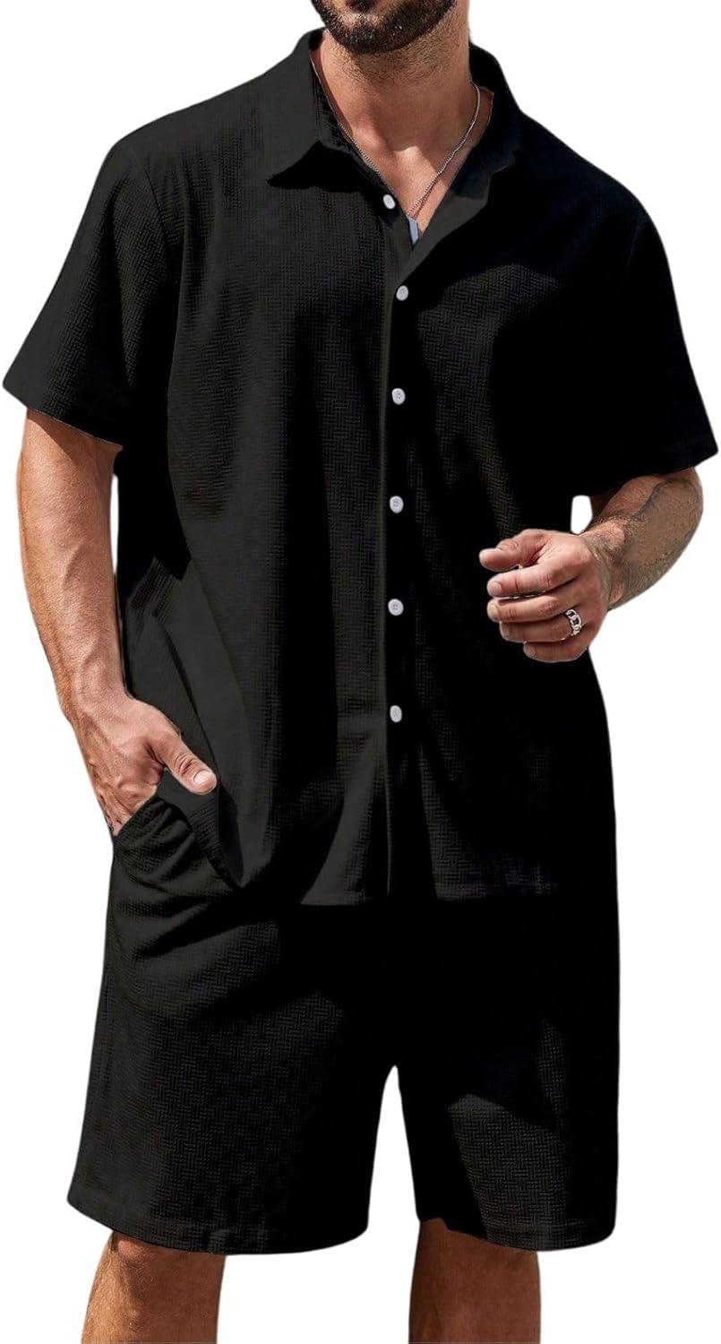 Verdusa Men's Plus Size 2 Piece Outfits Sweatsuit Button Down Shirt Short Sleeve Top and Short Tracksuits Set