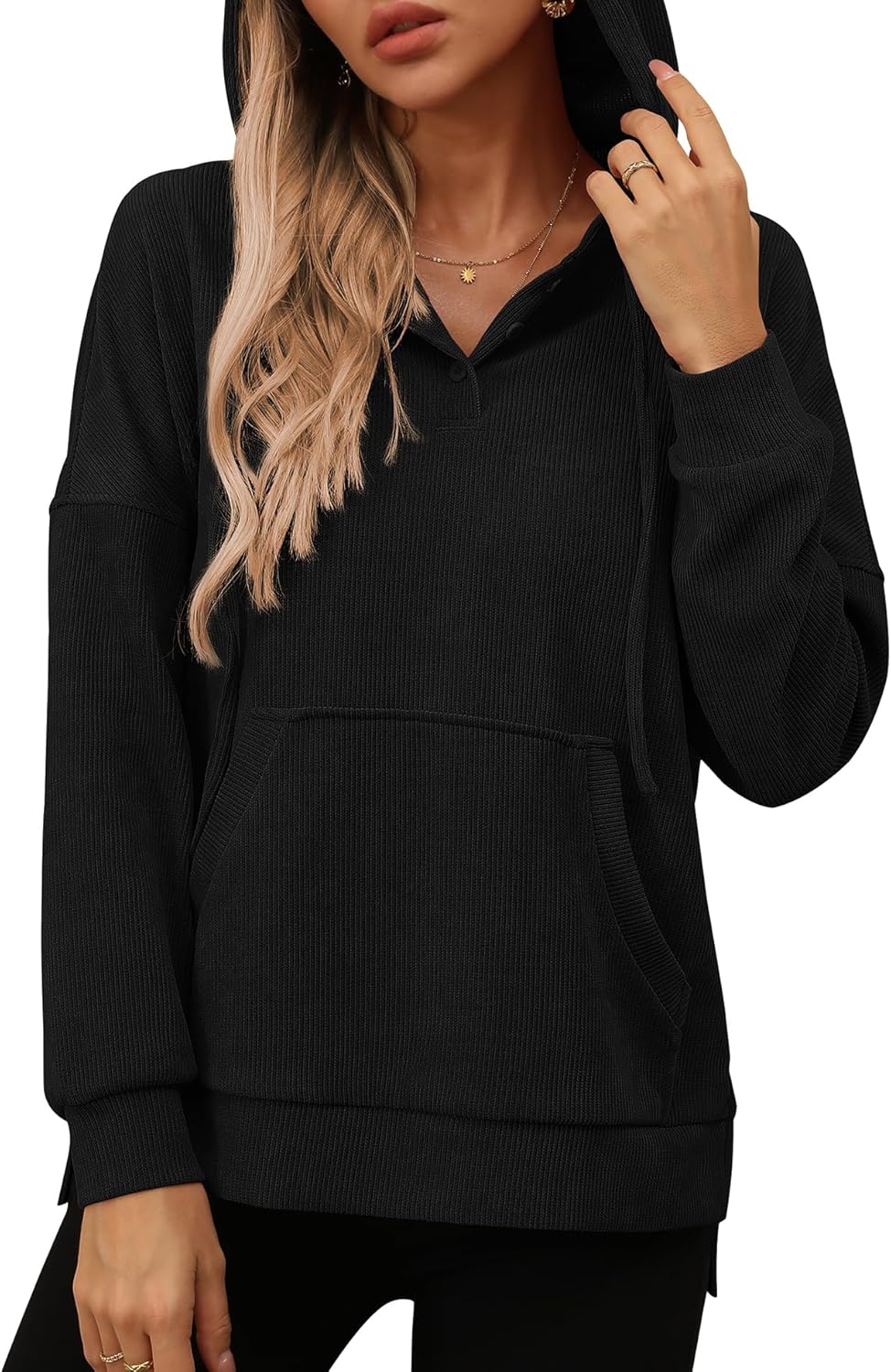 LILBETTER Womens Long Sleeve Pullover Hoodies Drawstring Sweatshirt Fall Knit Ribbed Tops with Pocket