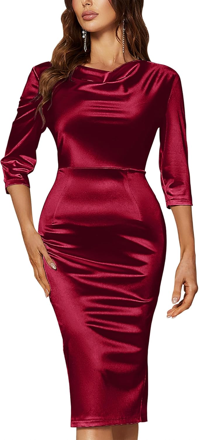 Women's Stunning Draped Collar 3/4 Sleeve Satin Cocktail Party Bodycon Dress