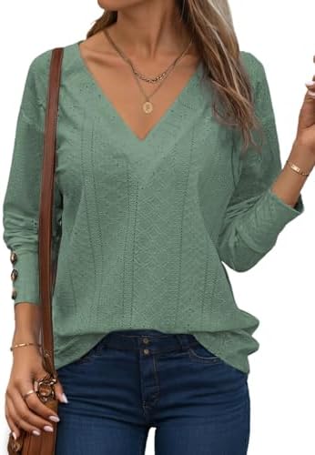 Dokotoo Womens Tops Dressy Casual V Neck Long Sleeve Shirts Buttons Business Casual Hollow Out Embroidered Tops