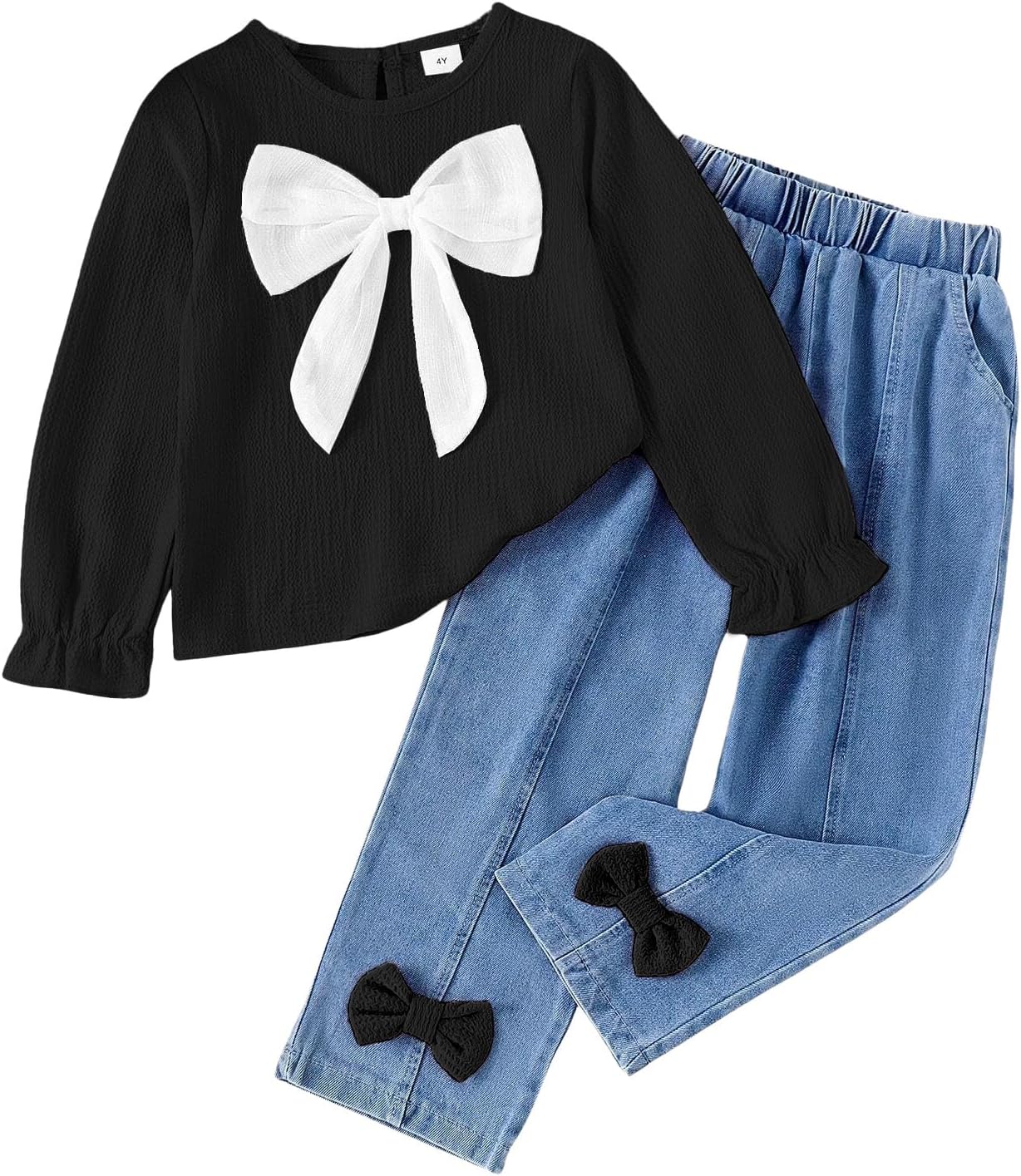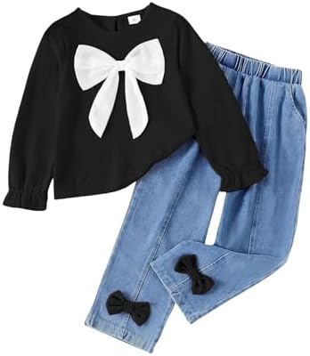 Kid Girl 2pcs Clothes Spring Summer Outfits Cute Sweet Bowknot Long Sleeve Bowknot Top + Denim Pants Set