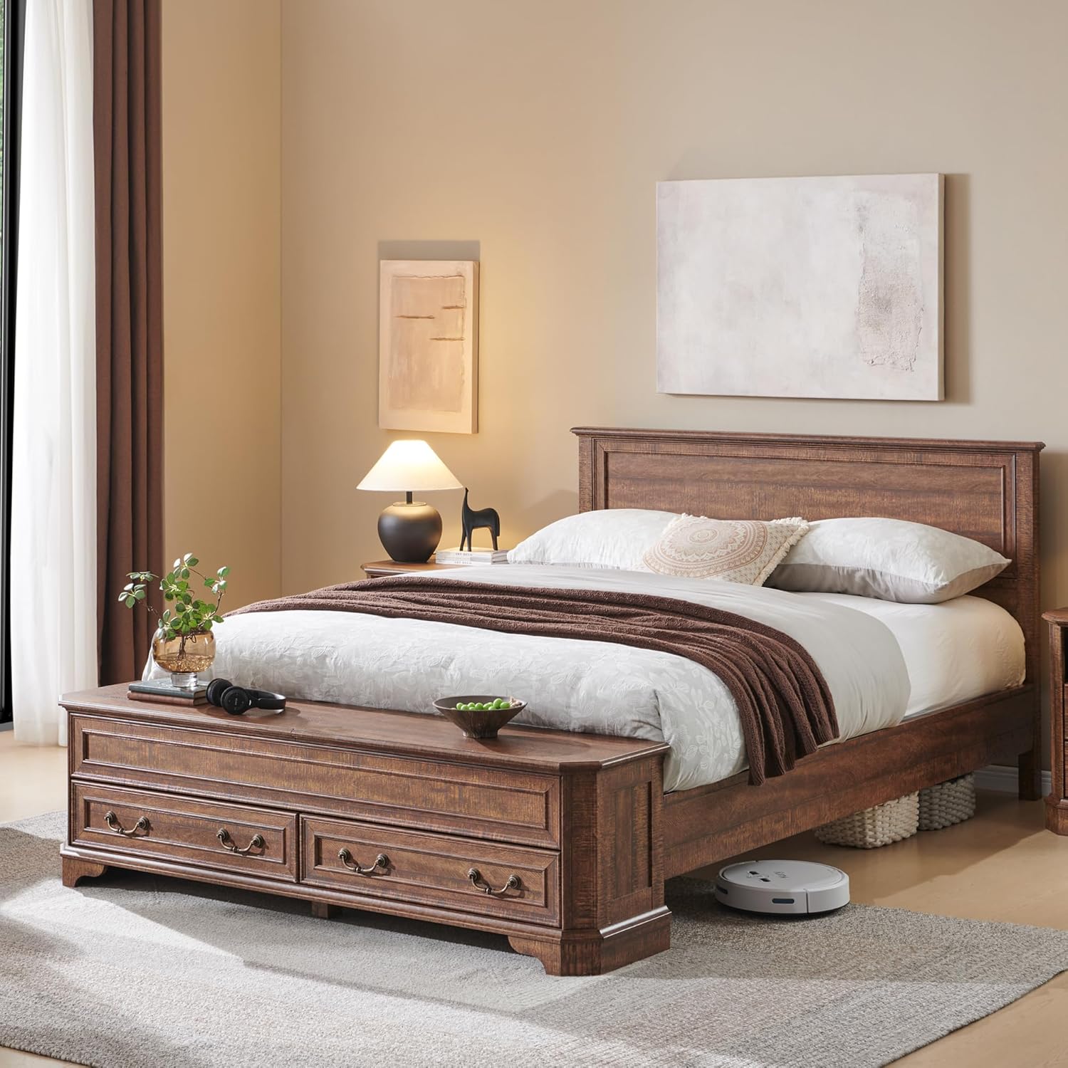T4TREAM Farmhouse Queen Bed with Headboard and Storage Bench, Rustic Wood Platform Bed with 64" Storage Chest w/ 4 Large Drawer, Dark Brown