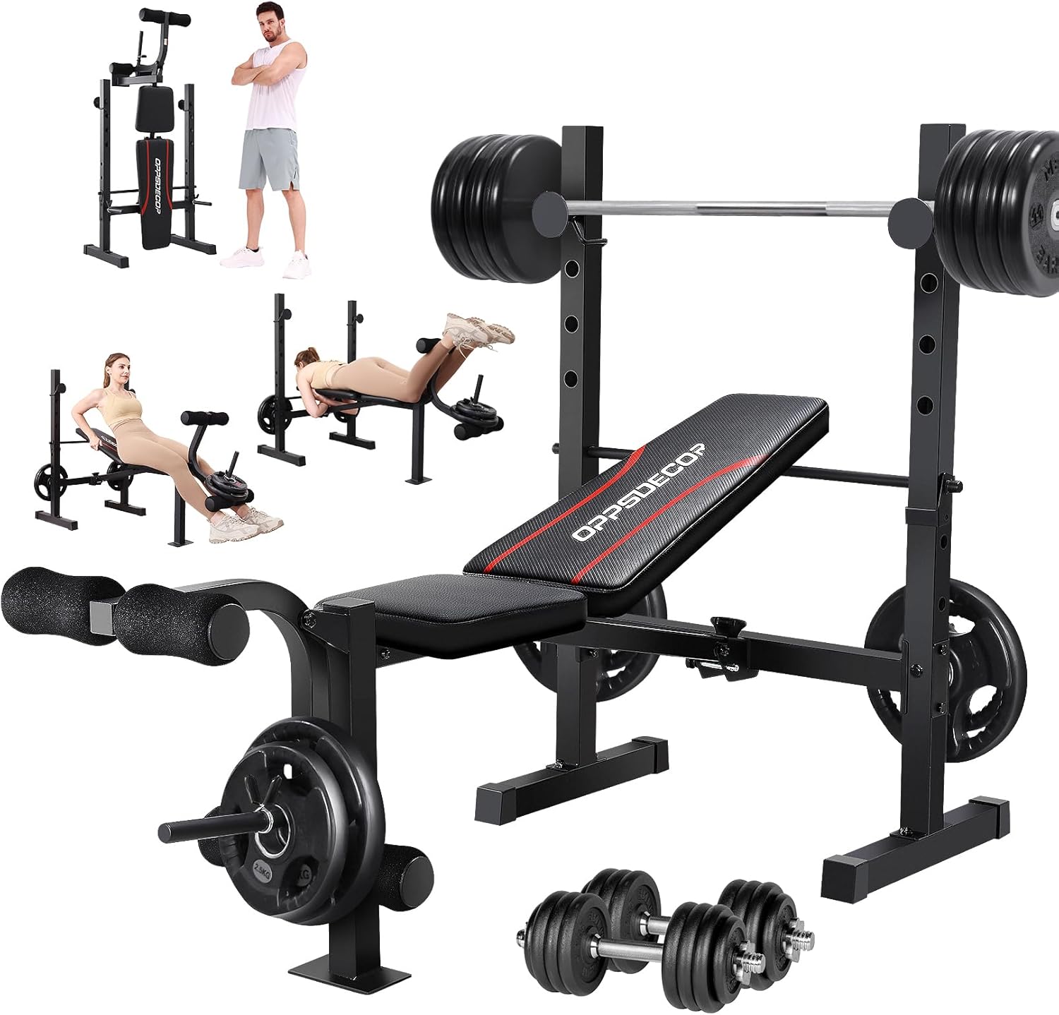OPPSDECOR Weight Bench Set, Multi-Function Adjustable Bench Press with Squat Rack Leg Extension & Leg Curl Workout Bench Foldable Workout Bench Flat/Incline/Decline Upgrade Weight Benches for Home Gym