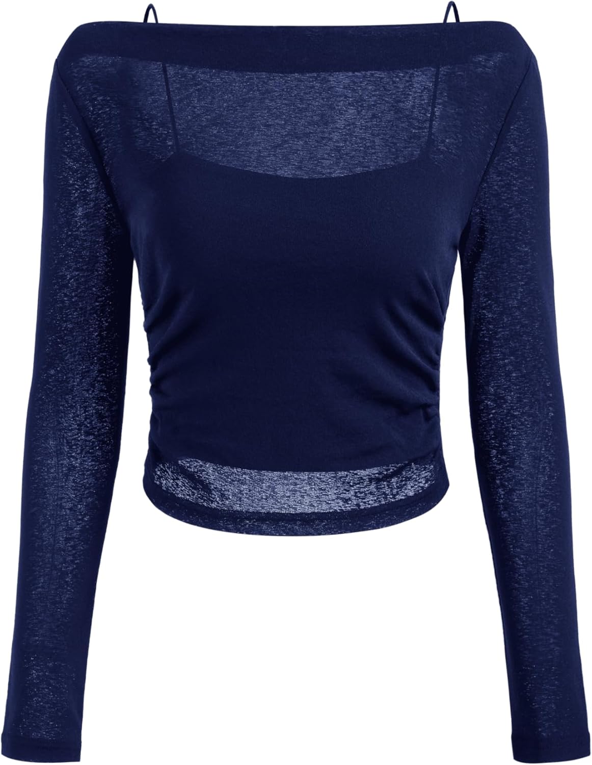 CIDER Oberteile Damen Langarmshirt Durchsichtiges Crop Top Slim Fit Boot Ausschnitt Cami Set Figurbetont