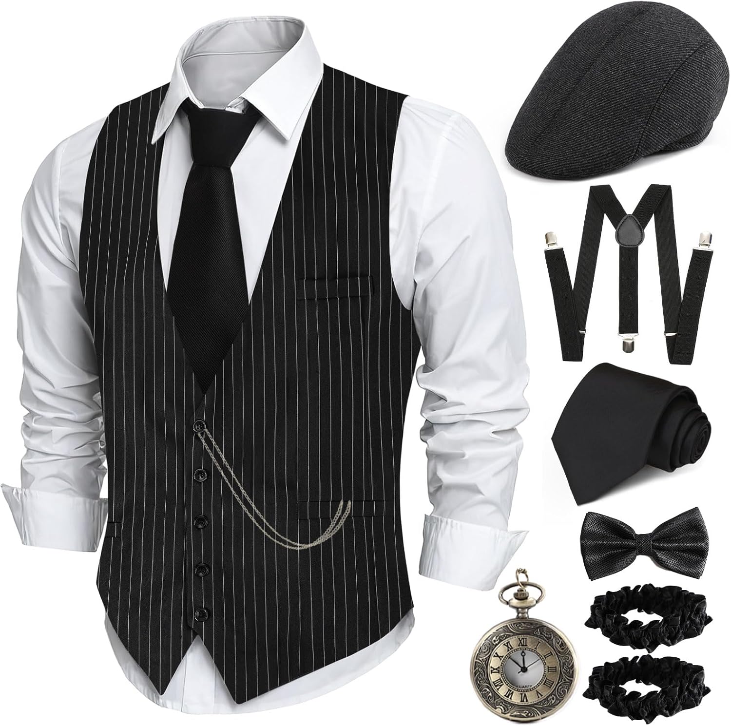 1920s Mens Costume,Roaring 20s Costumes for Men,1920S Mens Outfit Accessories with Vest Hat Pocket Watch Tie Armband