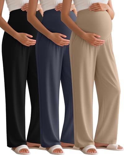 3 Pack Women's Maternity Pants Over The Belly Pregnancy Pants Stretchy Loose Wide Leg Lounge Pajama with Pockets