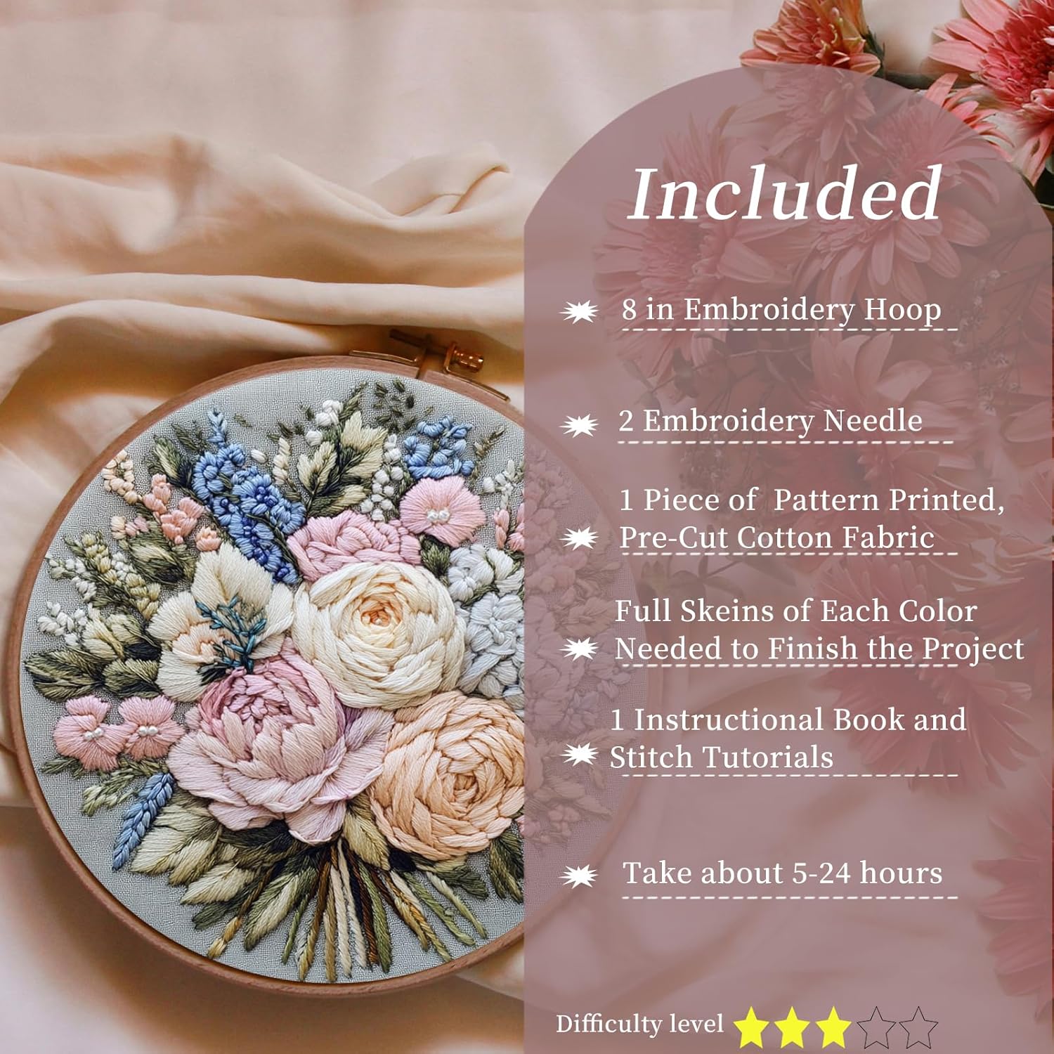 FONNUY Bouquet Flowers Embroidery Kit for Beginners, Pre-Stamped Pattern Kits for Adults with Hoop, Easy to Follow Color Thread Needlework, 8'' Hoop (Heartwarming)