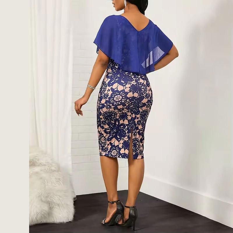 Yajedo Womens Retro Bodycon Midi Dresses Sexy Mesh Lace Cape Sleeve V Neck Print Work Church Pencil Dress