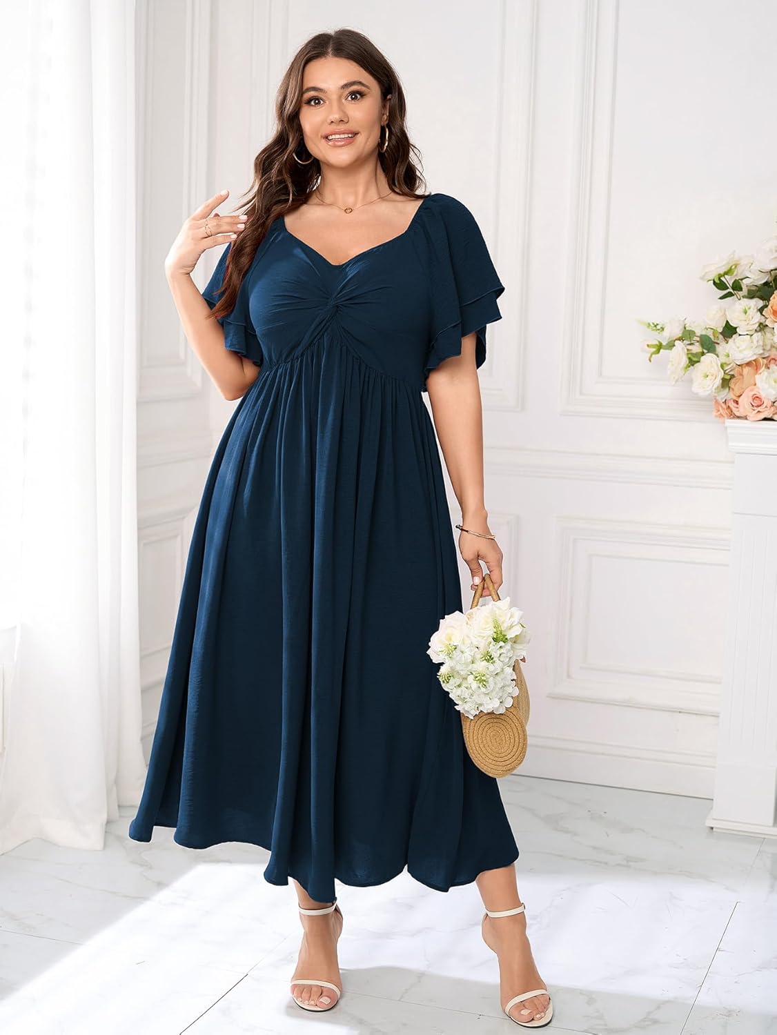 SCOMCHIC Women's Plus Size Wedding Guest Cocktail Dresses Sweetheart Neckline Ruffle Sleeve A Line Maxi Dress