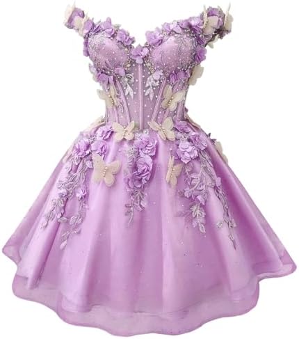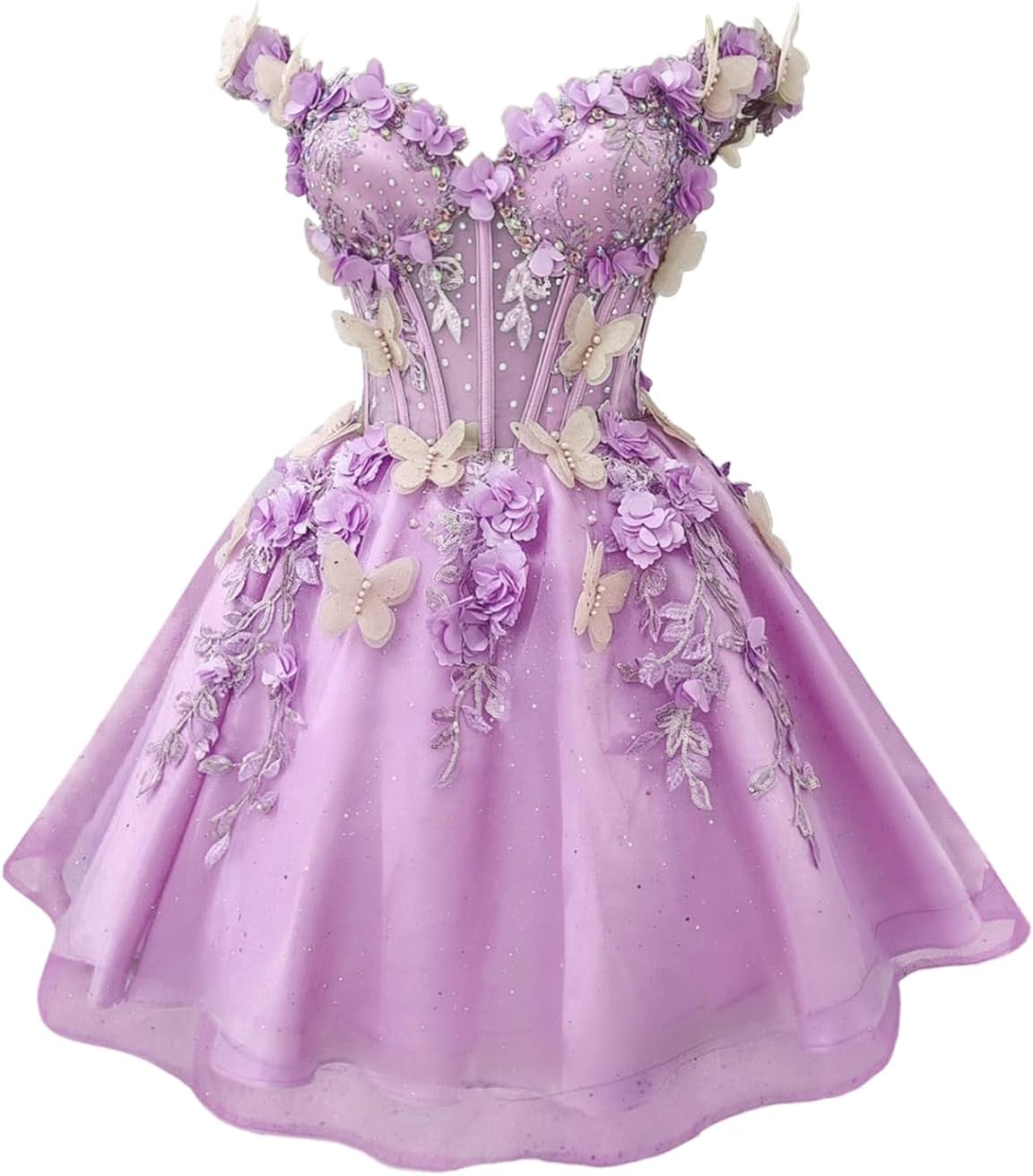 Youjiayi 3D Butterfly Short Homecoming Dresses for Teens Off Shoulder DAMA Dress for Quinceanera Puffy Tulle Short Prom Dress