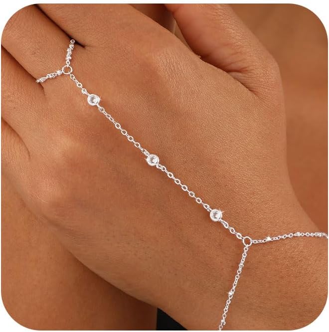 Hand Chain Bracelet for Women,Dainty 14K Gold/Silver Plated Finger Ring Chain Bracelet Cubic Zirconia Satellite Beads Hand Jewelry Body Trendy Jewelry Waterproof Gifts for Her