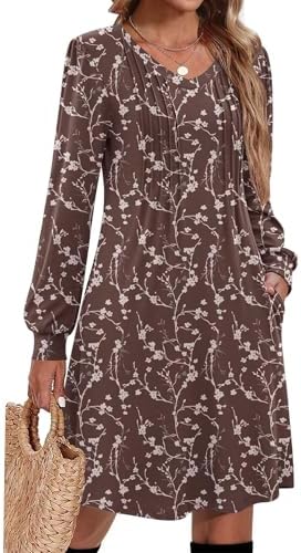 Zeagoo Fall Dresses for Women Long Sleeve Casual Pleated V Neck Dress 2025 A Line Tunic Dress