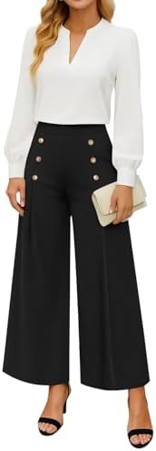 Womens Elastic High Waisted Wide Leg Pants Loose Casual Long Palazzo Trousers with Button Decor and Pockets