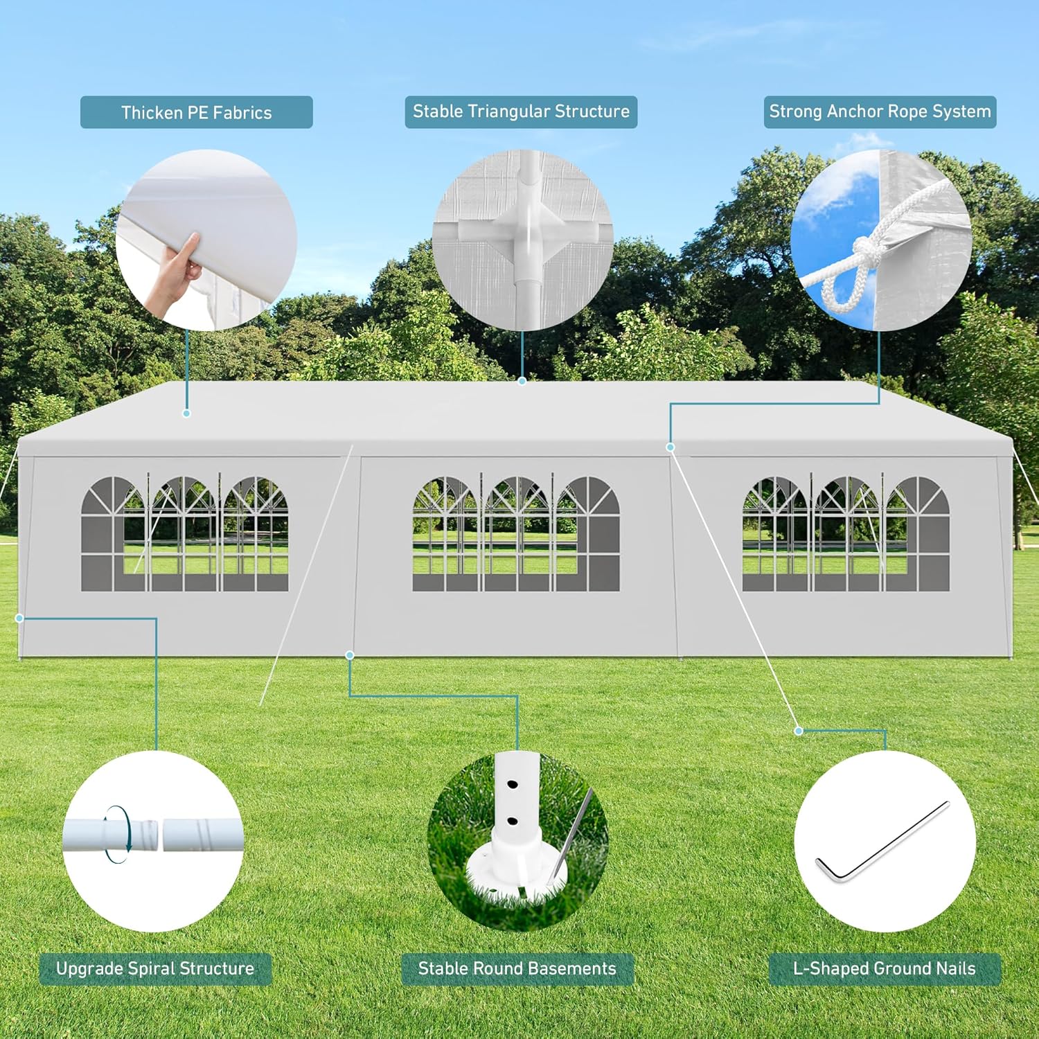 10' x 30' Outdoor Gazebo Tents with 8 Detachable Sidewalls, White Patio Canopy Tent, Shade Tents with Transparent Windows, Ideal for Party, Wedding, Birthday, Events, Gatherings