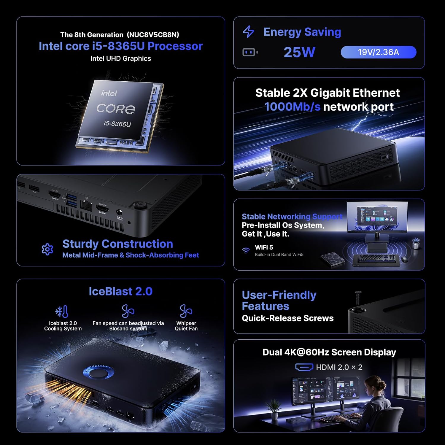 【Small but Powerful i5-8365U Processor】 - The Intel NUC BKCM8V5CB8N Modular Element Mini PC is powered by the i5-8365U Processor (4C/8T, 6MB Cache, up to 4.1GHz). Easily edit photos and videos, and use office software smoothly, making it an ideal PC for daily tasks in the office. With dimensions of 5.31 x 4.53 x 1.42 inches, it is incredibly small and portable, then can be taken anywhere.