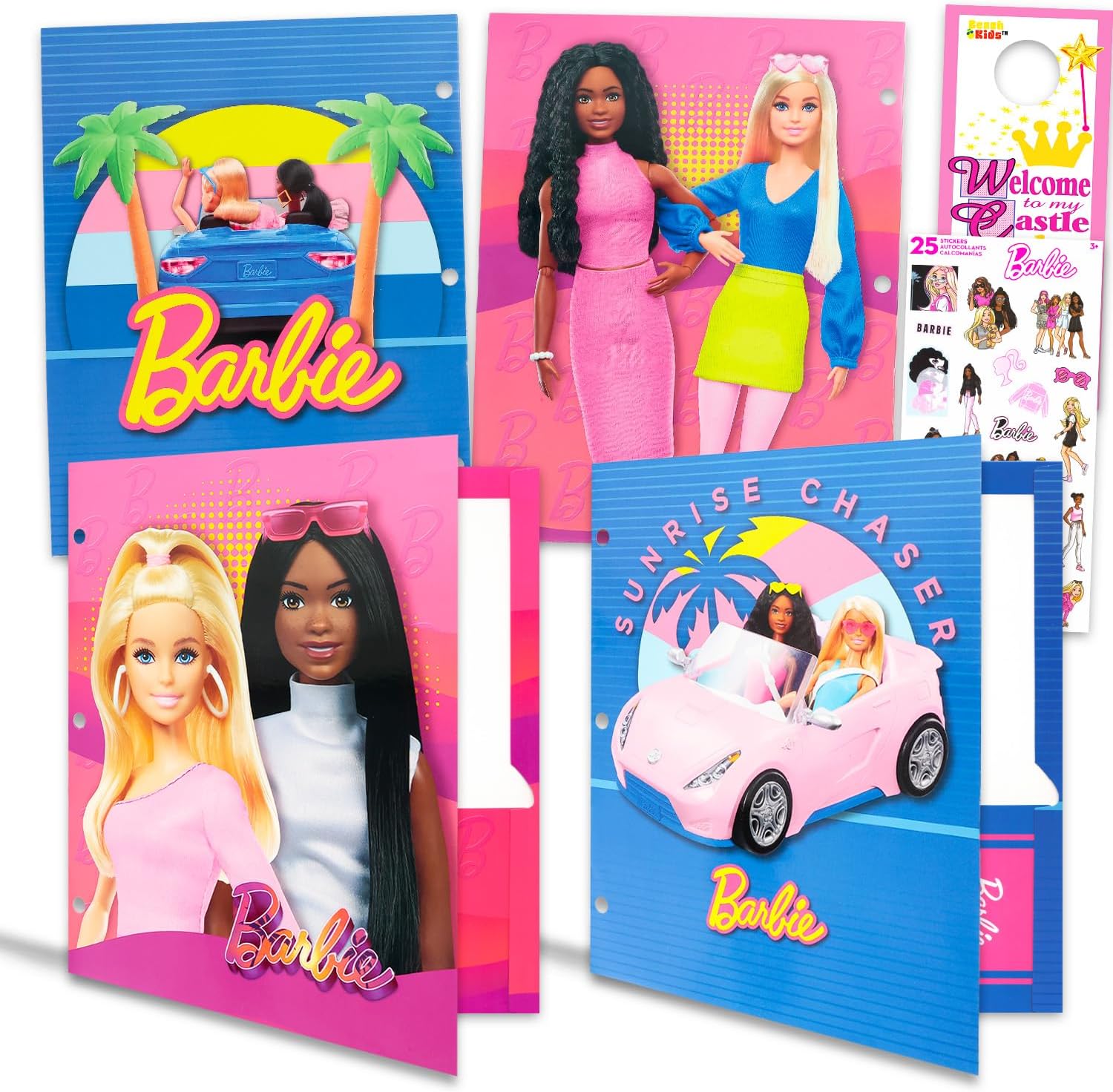 Barbie Folder Set - Bundle with 4 Heavy Duty Laminated Folders with 2 Pockets Each for School, Office Plus Stickers, More | Barbie Back to School Supplies Stuff.