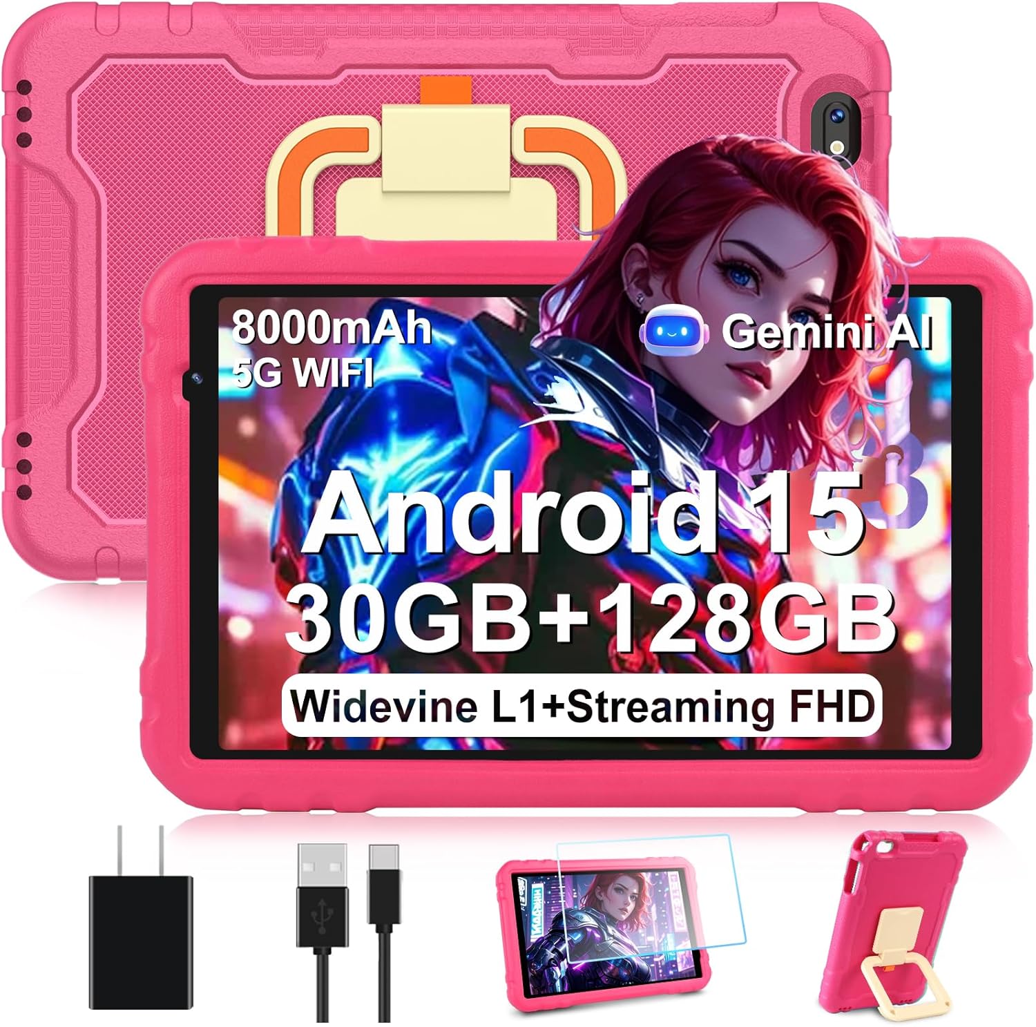 2025 Tablet 10 inch Android 15 Tablets 30GB RAM 128GB ROM 1TB Expand, 8000mAh Octa-Core Tablet with Drop-proof Case, Gemini AI, HD IPS Display, GPS, 5G WIFI, Split-screen, Widevine L1 -Metal Rose Red