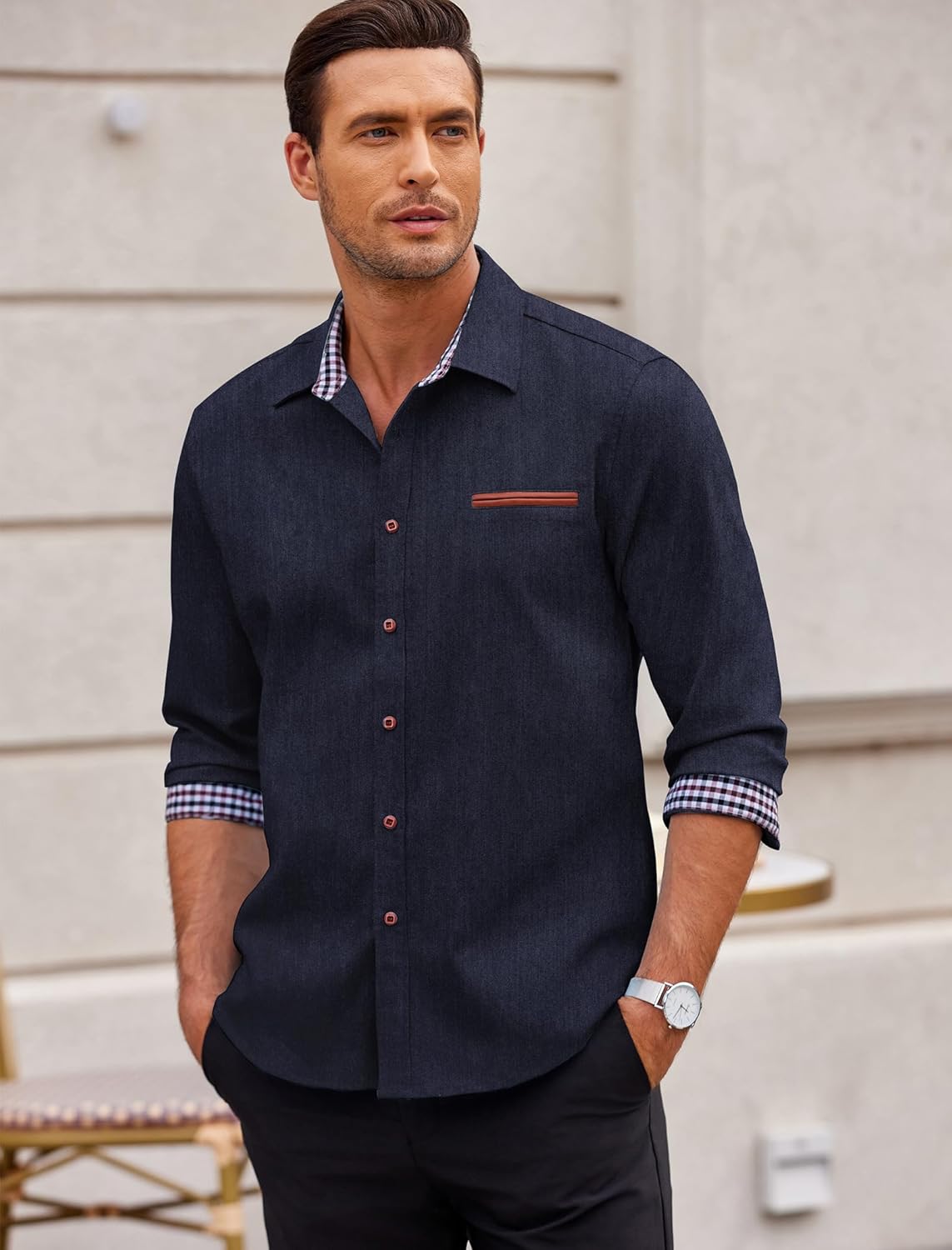 COOFANDY Men's Casual Dress Shirt Button Down Shirts Long-Sleeve Plaid Collar Denim Work Shirt