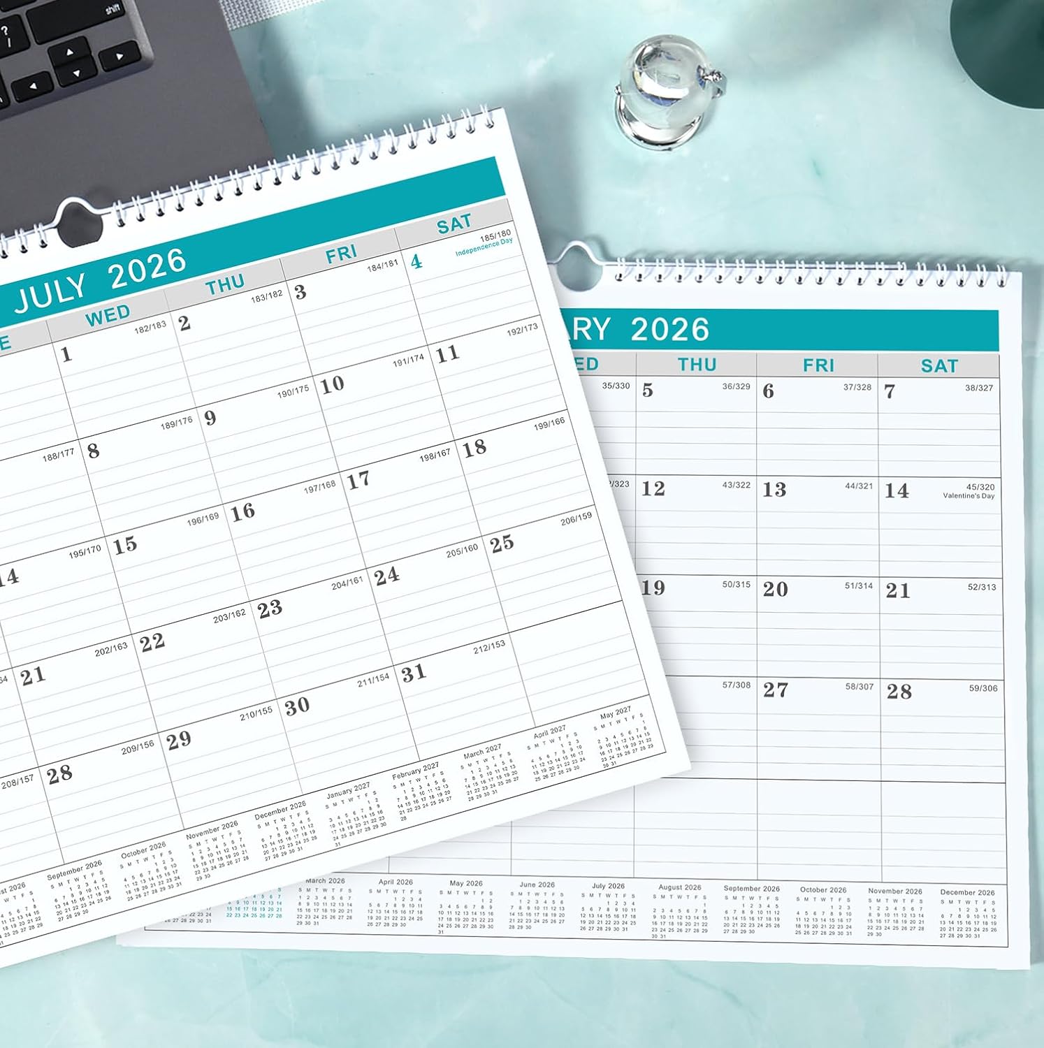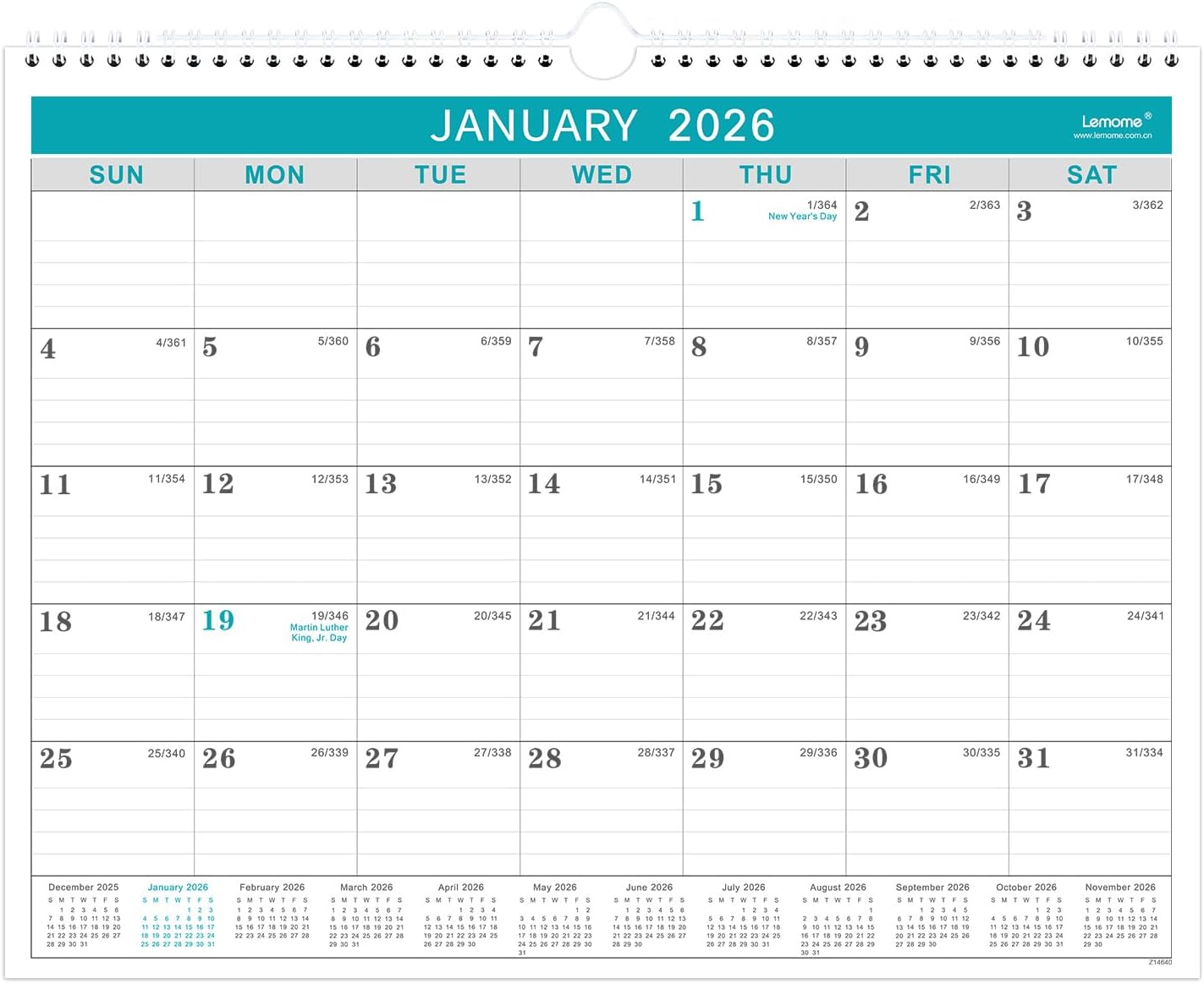 ENHANCED ORGANIZATION – This wall calendar 2026 measures 14.6 inches wide by 11.5 inches high, an ideal size for daily use. Full year reference calendars are shown on each page for quick date checking and future planning.