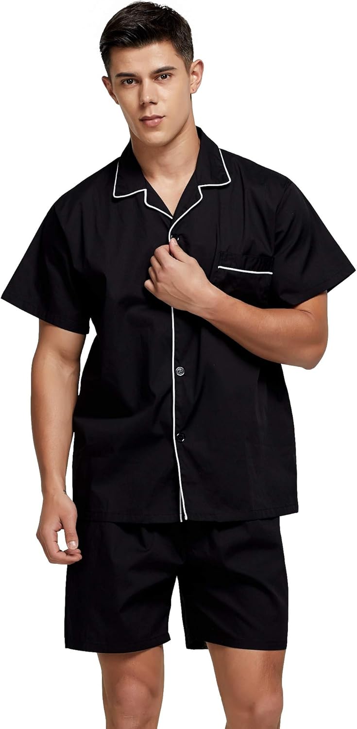 Mens Cotton Pajamas Short Sleeve Pajama Set Woven Sleepwear Loungewear Nightwear
