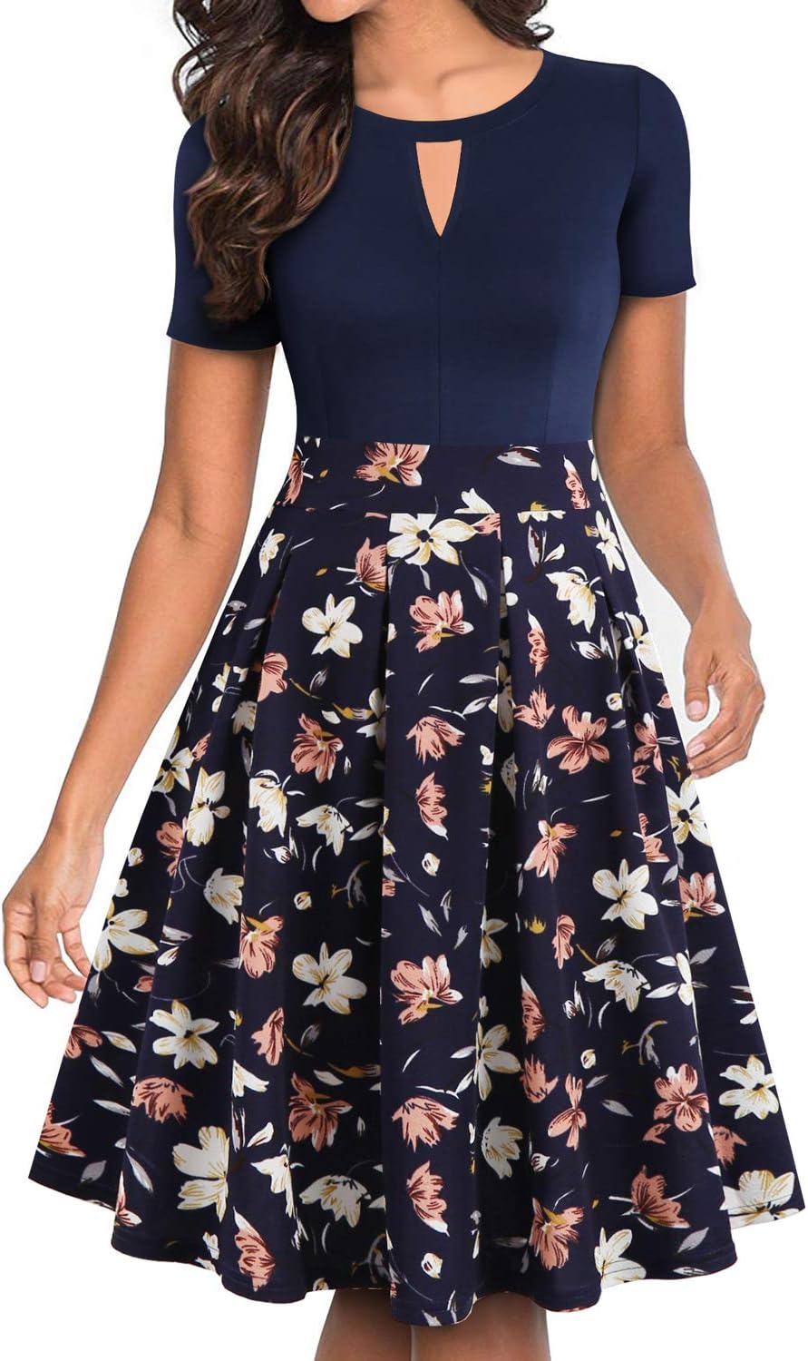 YATHON Women's Vintage Floral Flared A-Line Swing Casual Party Dresses with Pockets