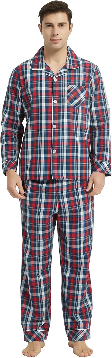 Vulcanodon Mens Cotton Pajama Set, Button Down Woven Pajama Set for Men Plaid Men's Sleepwear