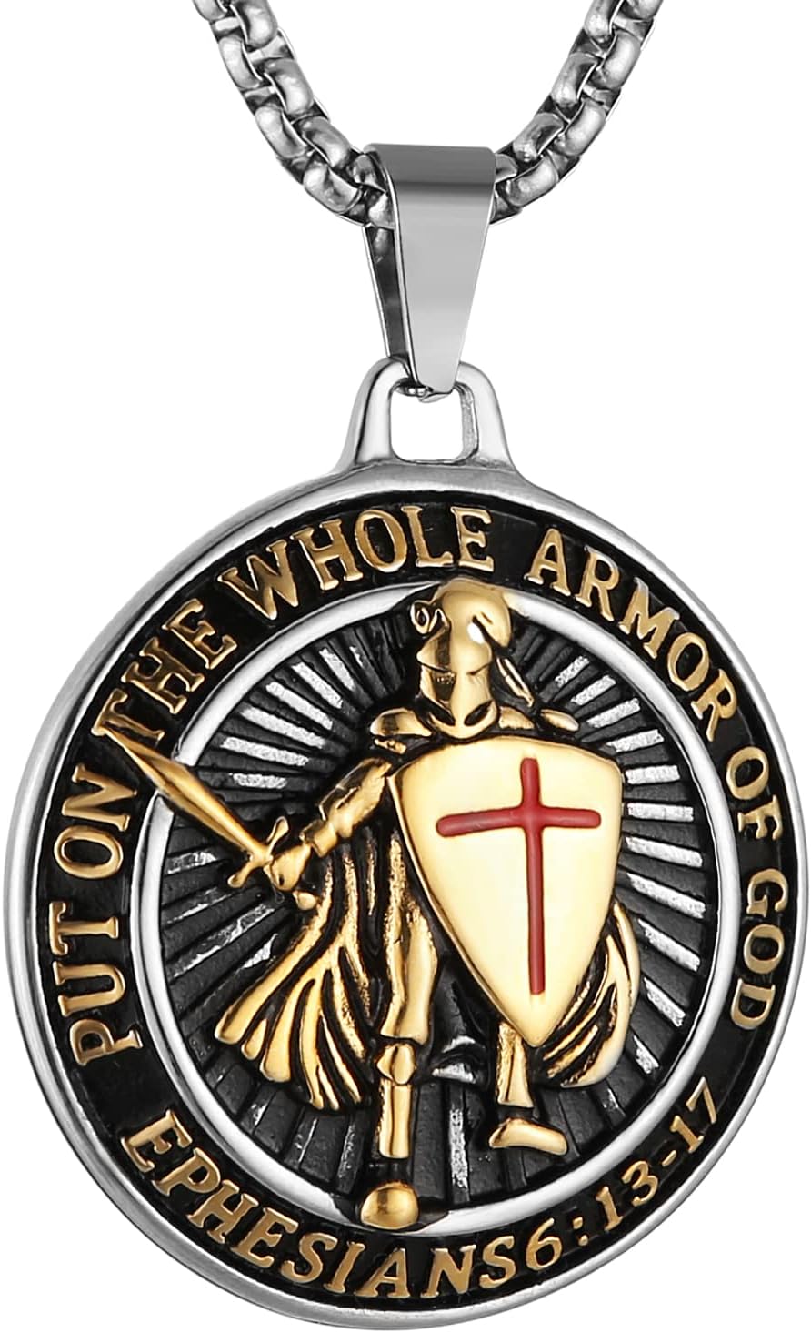 HZMAN Knights Templar Put On The Whole Armor of God Ephesians 6:13-17 Red Cross Design Stainless Steel Necklace for Men