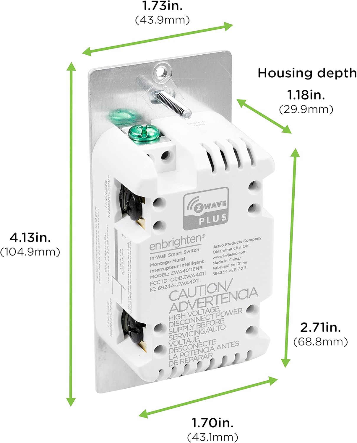 Home automation is even smarter with the Enbrighten Z-Wave In-Wall Smart Switch with QuickFit™ and SimpleWire™. When paired with a compatible hub, the hardwired smart switch operates wall, ceiling and accent lighting through individual commands and programmed settings. Wirelessly control and schedule indoor or outdoor fixtures for effortless management of your home. Your automation possibilities are seemingly infinite when connected to hubs from Ring, Wink, SmartThings, HomeSeer, Vera, American Standard and more. About Z-Wave Plus and 700 series with S2 security and SmartStart Z-Wave Plus and 700 series further enhance the security and simplicity of previous Z-Wave products. In addition to remaining backward compatible with all Z-Wave generations, 700-series devices feature multiple advancements, including: €¢ Over-the-air updates and doubled internal memory. €¢ More powerful, robust network capabilities. €¢ S2 security with best-in-class secure key exchange to add a layer of 128-bit encryption. €¢ SmartStart, which offers unique QR codes for fast, easy pairing. €¢ Up to five-year battery life with one coin cell for battery-powered devices.