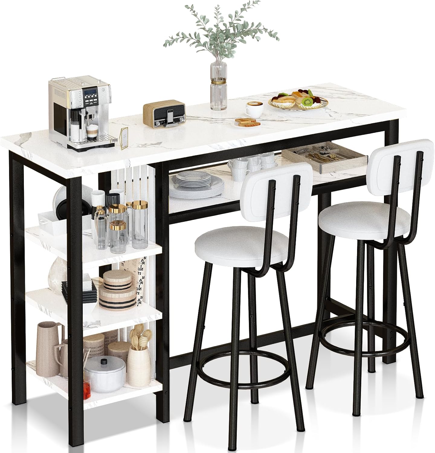 [PERFECT STORAGE SPACE] --- This set of bar dining set not only has a spacious table top, but also an extra storage layer under the table top. Including 3 open storage shelves on the side, will make your room more organized.