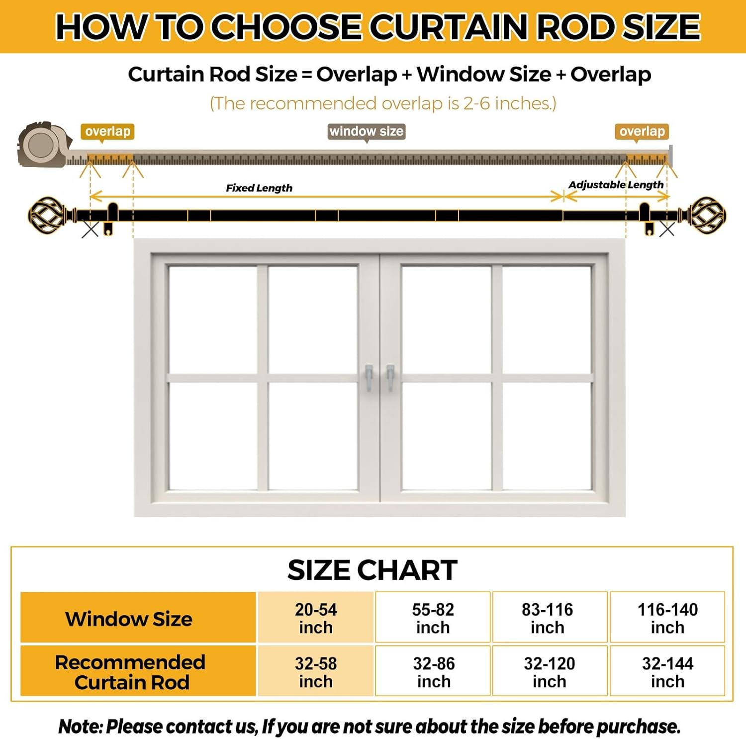 𝐓elescoping & 𝐒plicing 𝐃esign:USFOOK curtain rod features a multi-pole telescopic structure, adjustable from 32 to 58 inches to fit windows 20 to 54 inches. For any questions about sizing or structure, please contact us