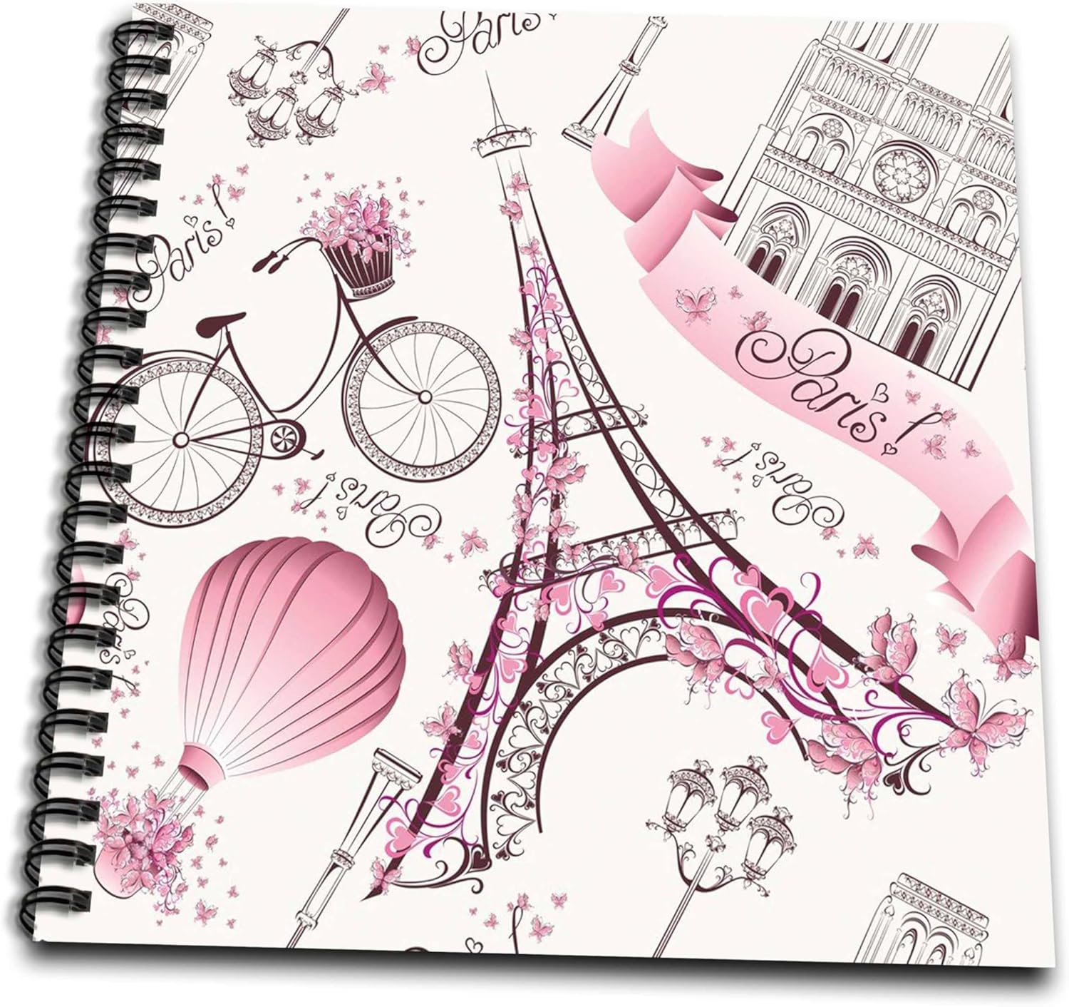 eiffel tower, notre dame, pink flowers, paris, hot air balloons, pattern, pretty Drawing Book is a great way to start sketching, drawing, designing, scrapbooking, or just jotting down your thoughts. This unique spiral bound hard covered book includes acid free bright white paper and features twin loop wire spring binding. Our Memory and Drawing books are a great alternative to the standard photo album or notebook. While our Mini Notepad is a great size for keeping in your purse, car, briefcase or on the go. Perfect for use with crayons, markers, paints, pastels, stickers, pencils and pens. Great as a gift for any occasion. Enjoyed by all ages.