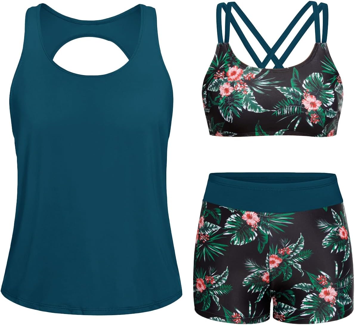 Yonique 3 Piece Tankini Swimsuits for Women Bathing Suits with Boy Shorts and Swim Tank Top Bra Modest Swimwear