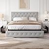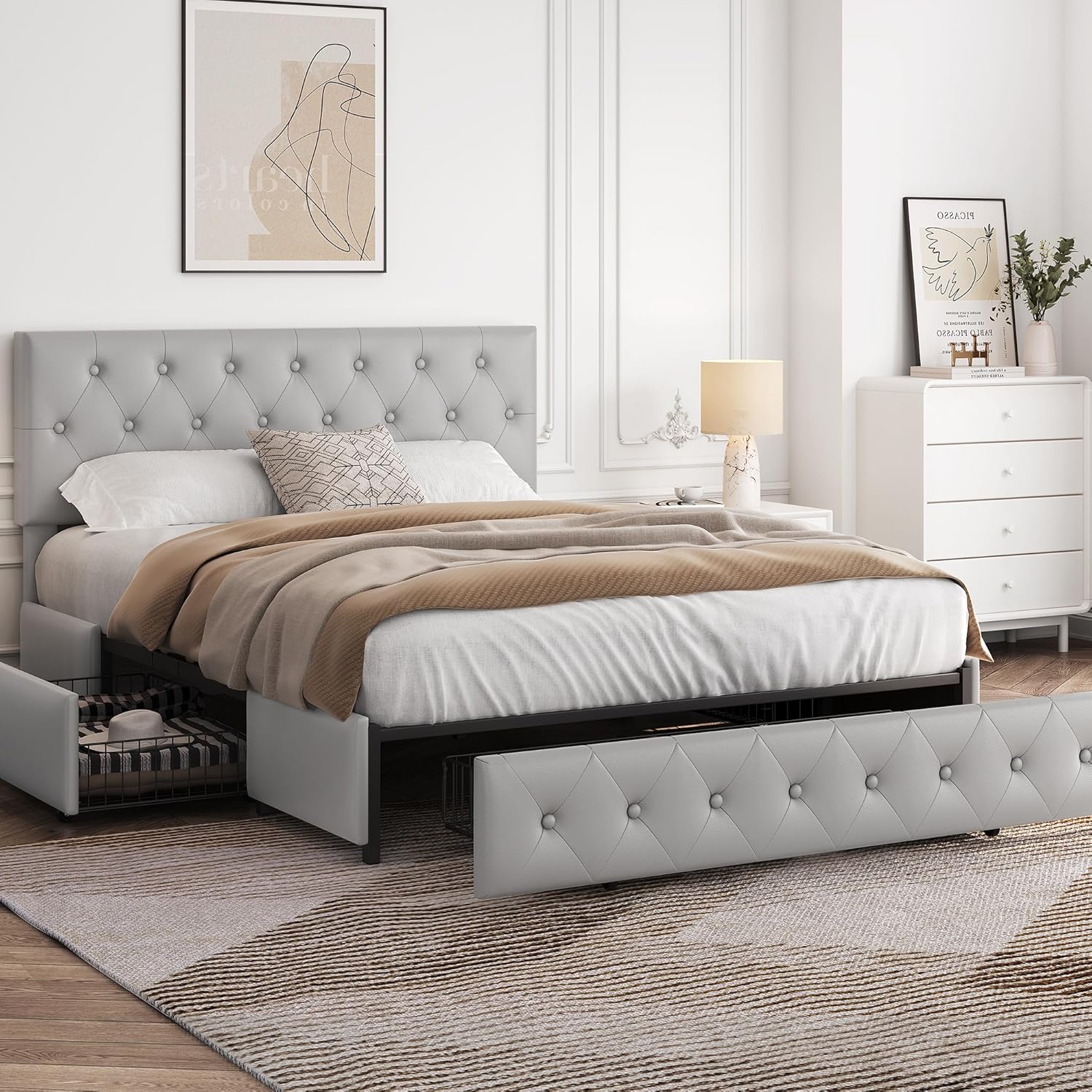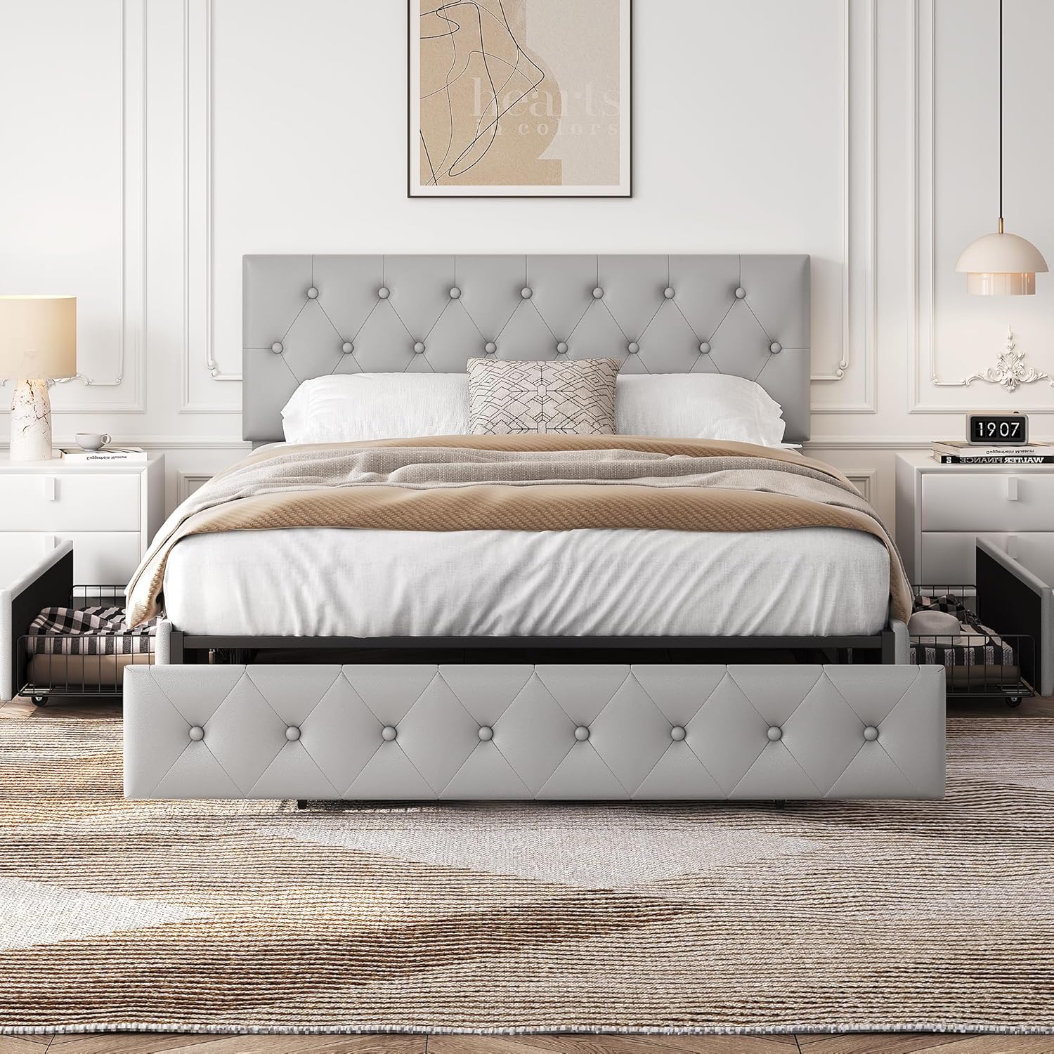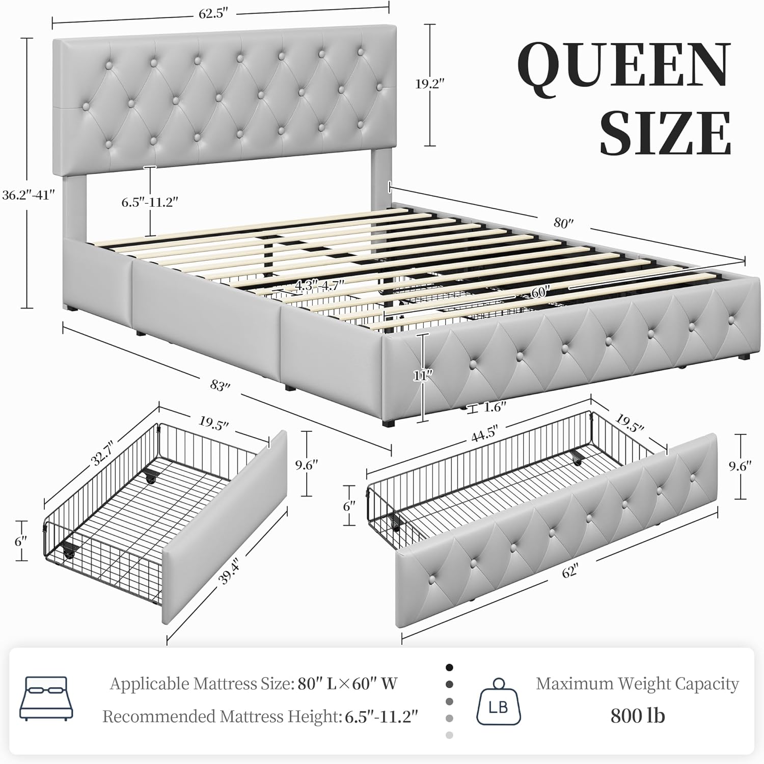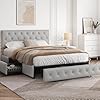 Yaheetech Queen Bed Frame with Adjustable Diamond Button-Tufted Headboard/3 Drawers Storage, Queen Platform Bed/Strong Wooden Slats, Light Gray