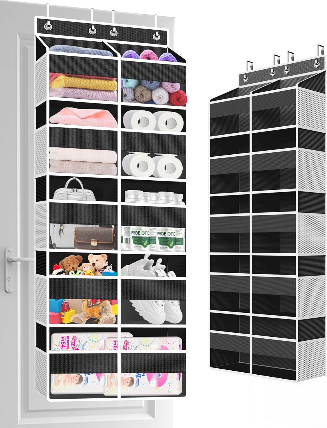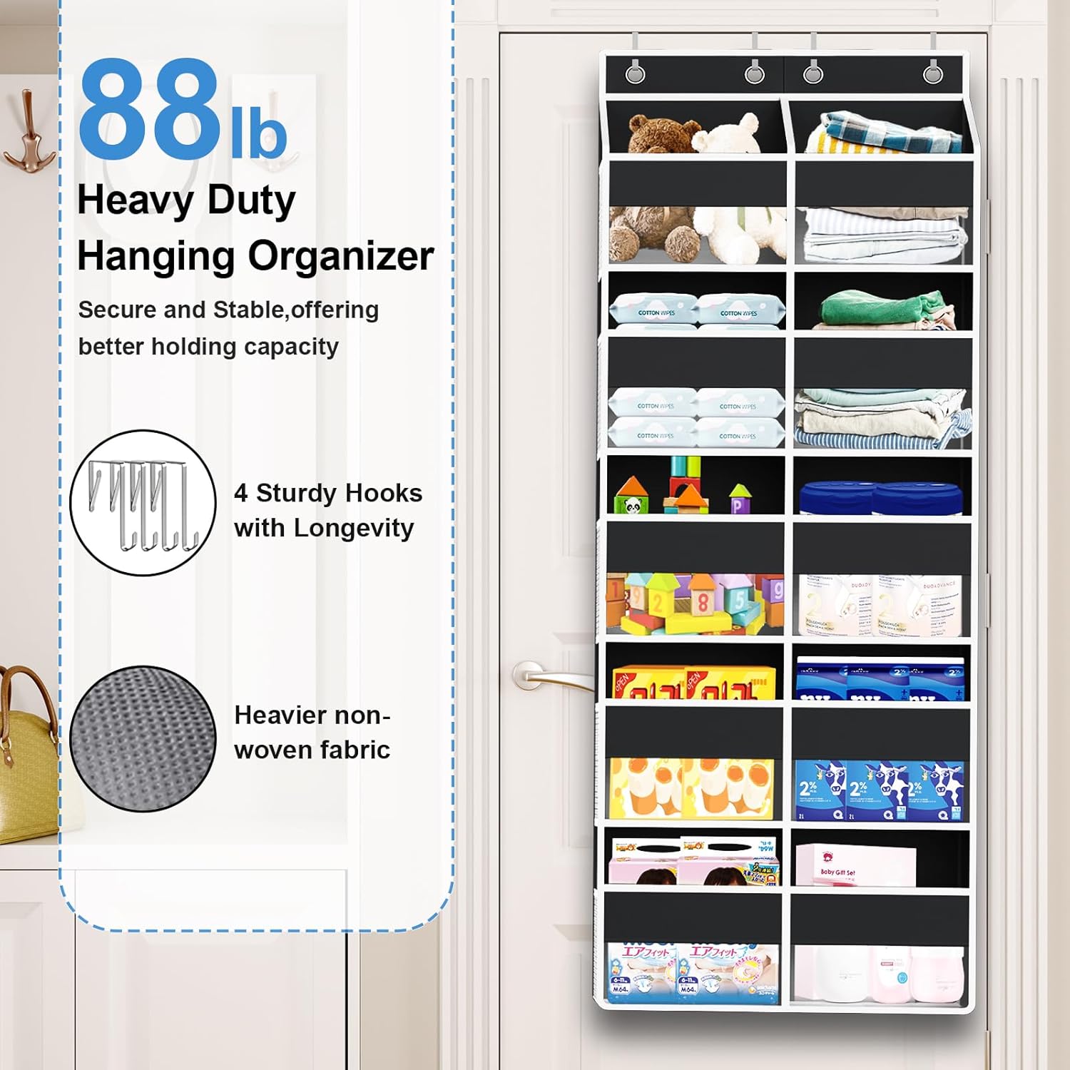 Versatile Storage:Our large hanging door organizer is perfect for expanding storage space and suitable for for closet organizers and storage,bathroom organizers and storage,toy storage organizer.4 portable hooks design make it easy to be placed in kids room, storage room,office,laundry room,bedroom,bathroom,living room,storage room,dorm,nursery and other areas to store toys,diapers,baby cloth,socks,cosmetics,shoes,purse,cloth,sewing,yarn and other items